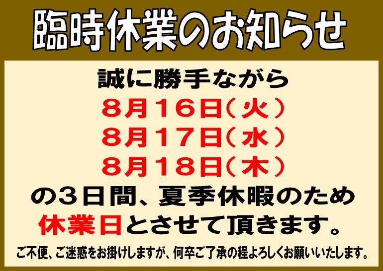 当店では、誠に勝手ながら下記の3日間、夏季休暇のため休業日とさせて頂きます。