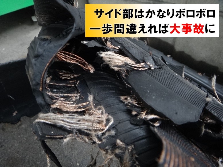 タイヤ交換の際に、ホイールから外したバーストタイヤを見ていくお話です。