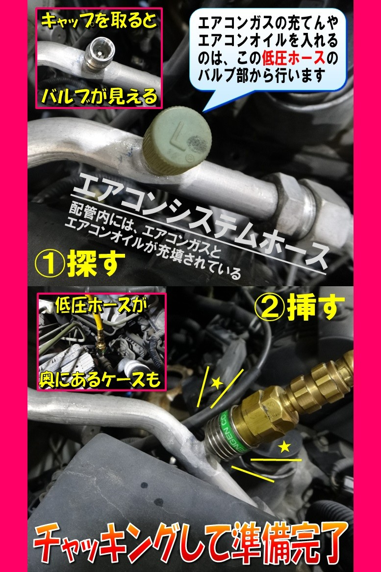 低圧側である【L】キャップがついたホースのアクセスポイントから施工します。