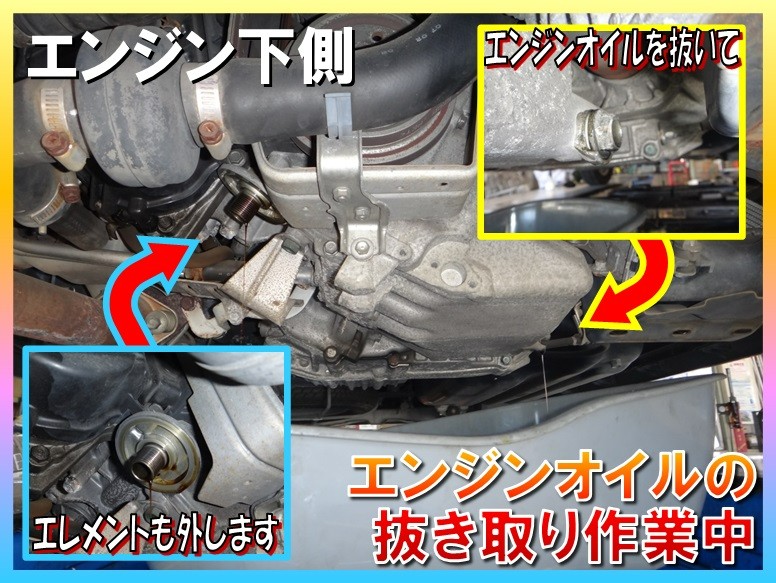 エンジンオイルならびにエレメントの抜き取り作業に入ります。