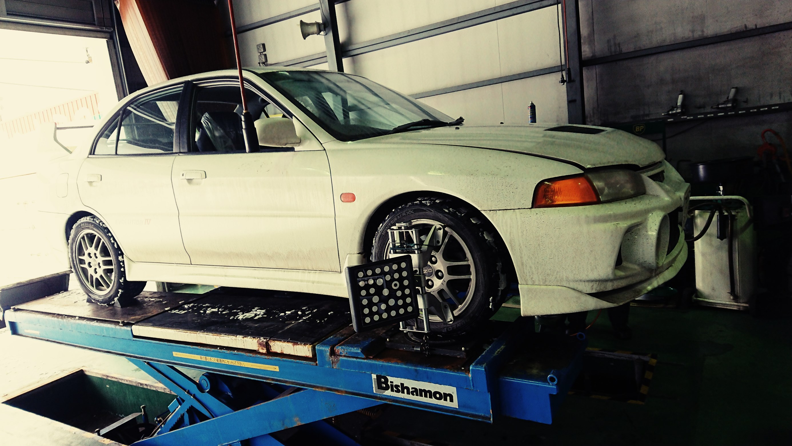 リヤのロアアーム左右交換を行なったランサーエボ4のアライメント調整を致しました。