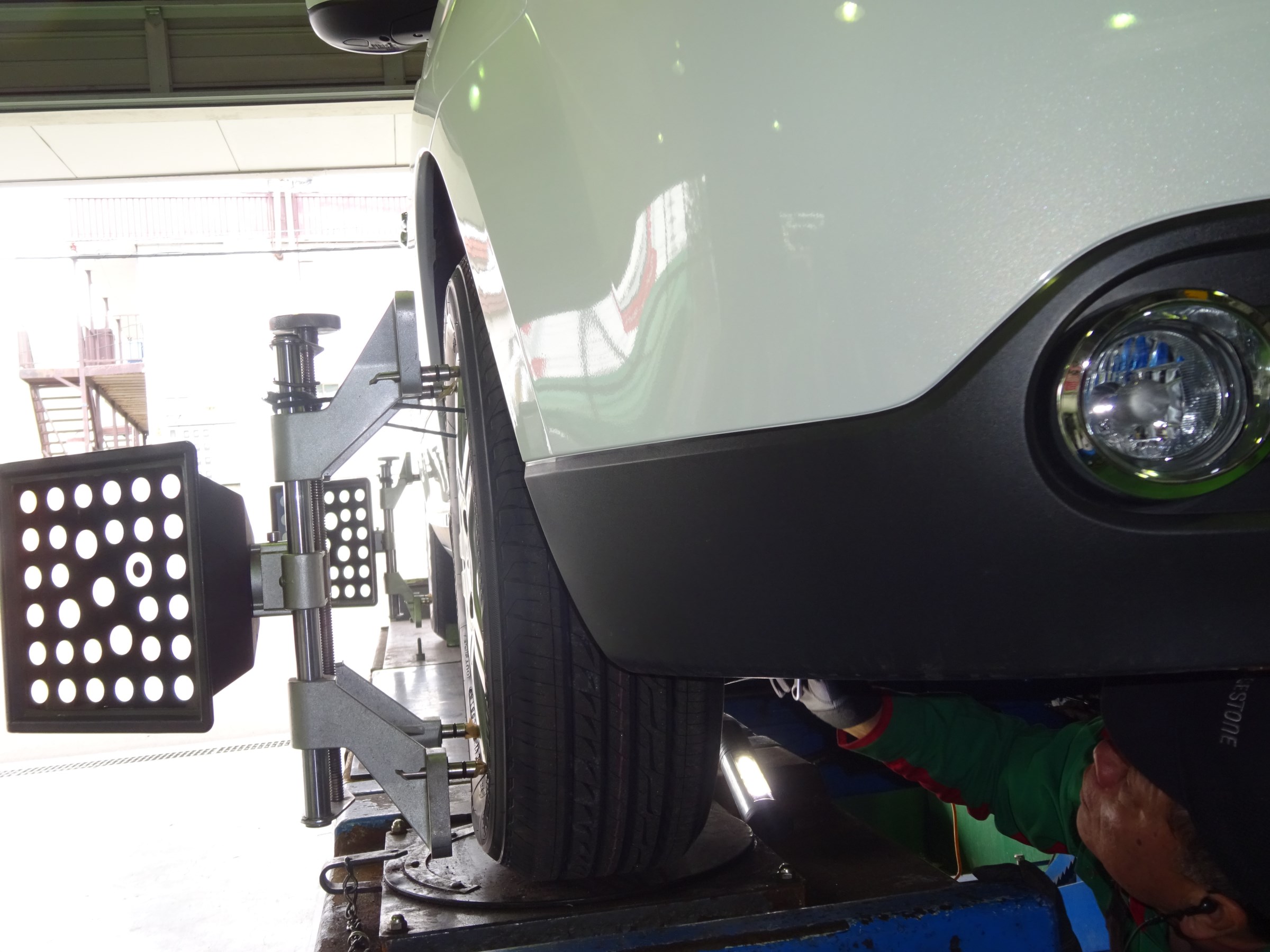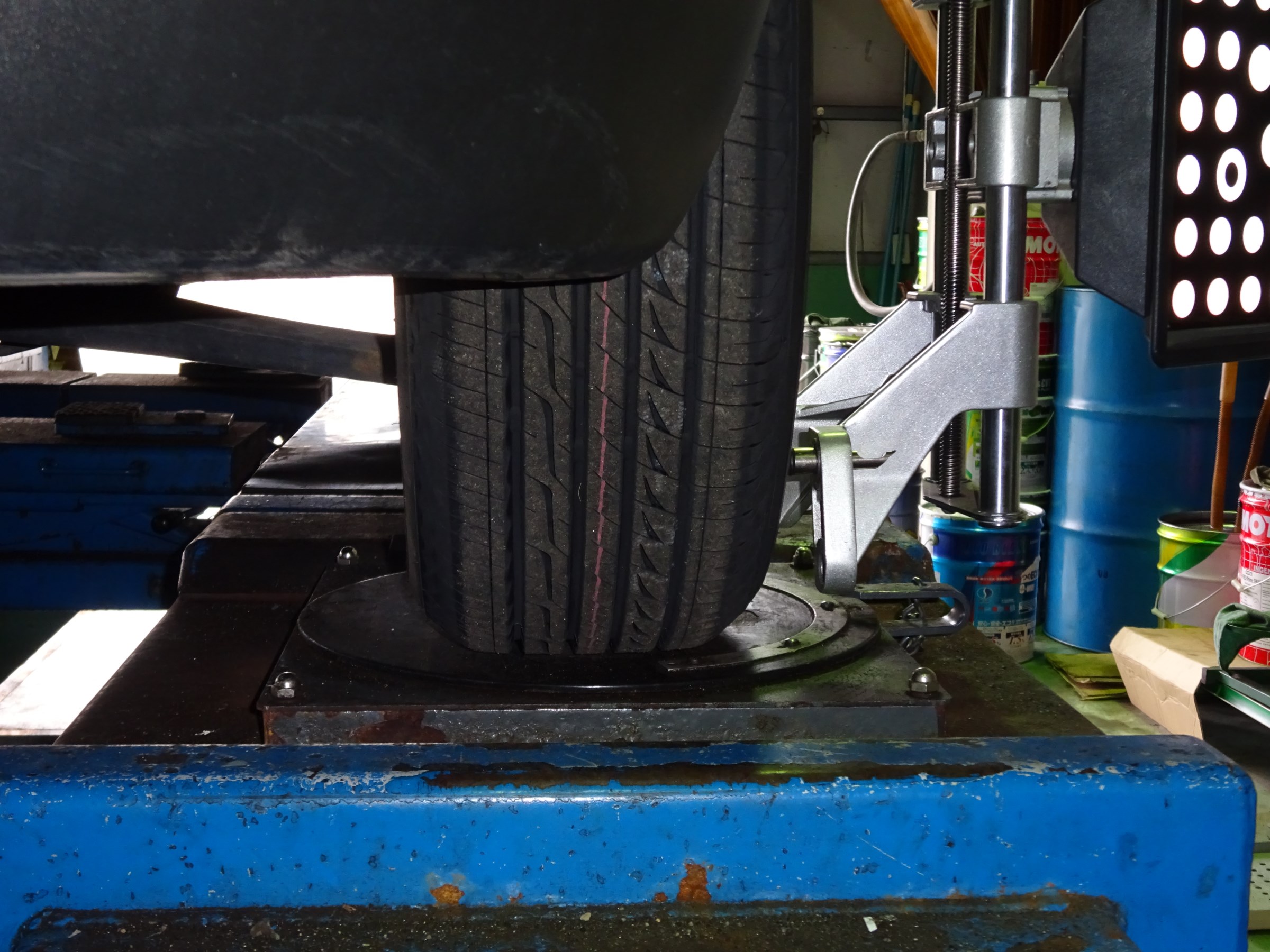 こんな作業です。タイヤの角度を測ってしっかり接地しているかを見ています。