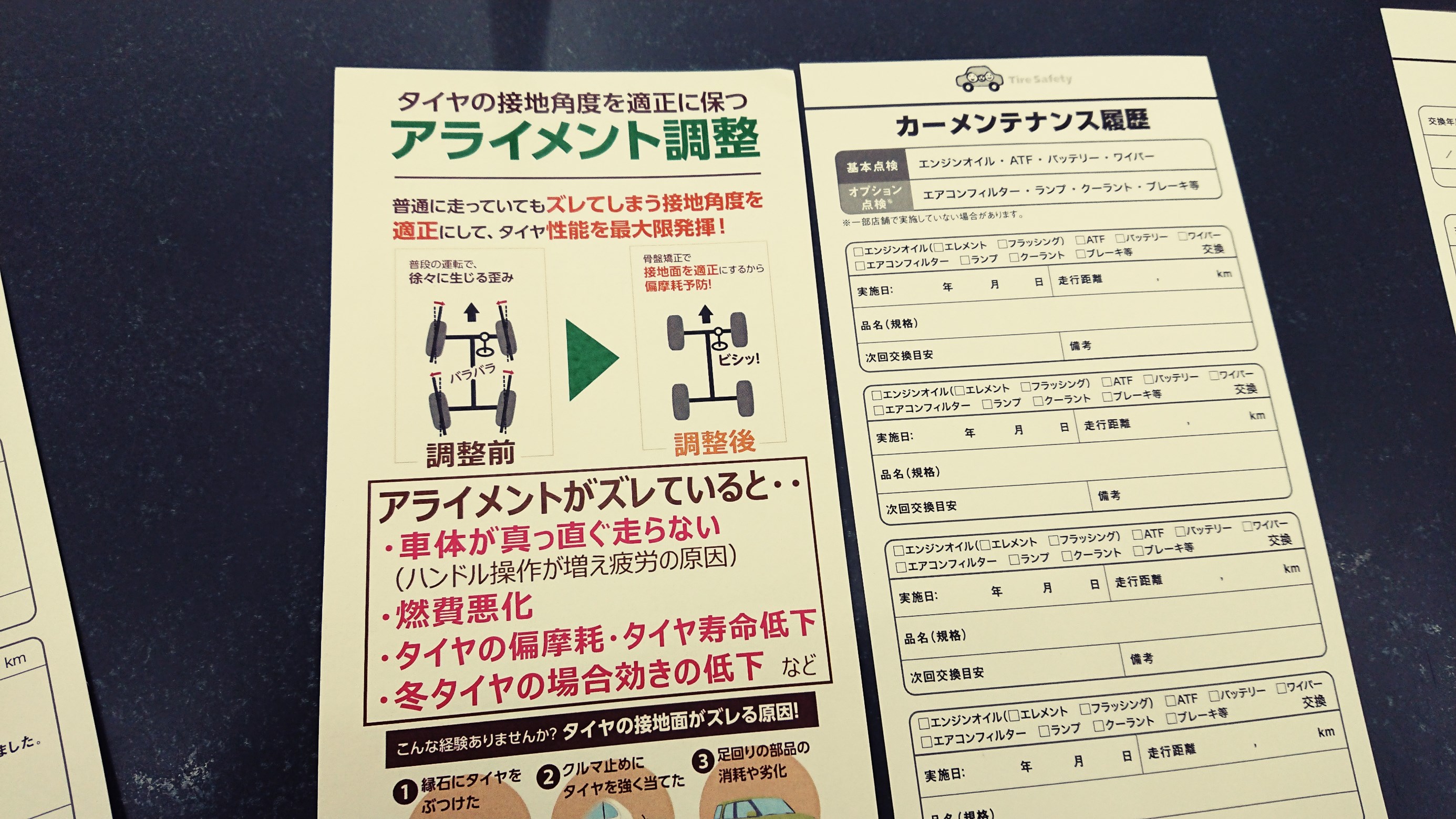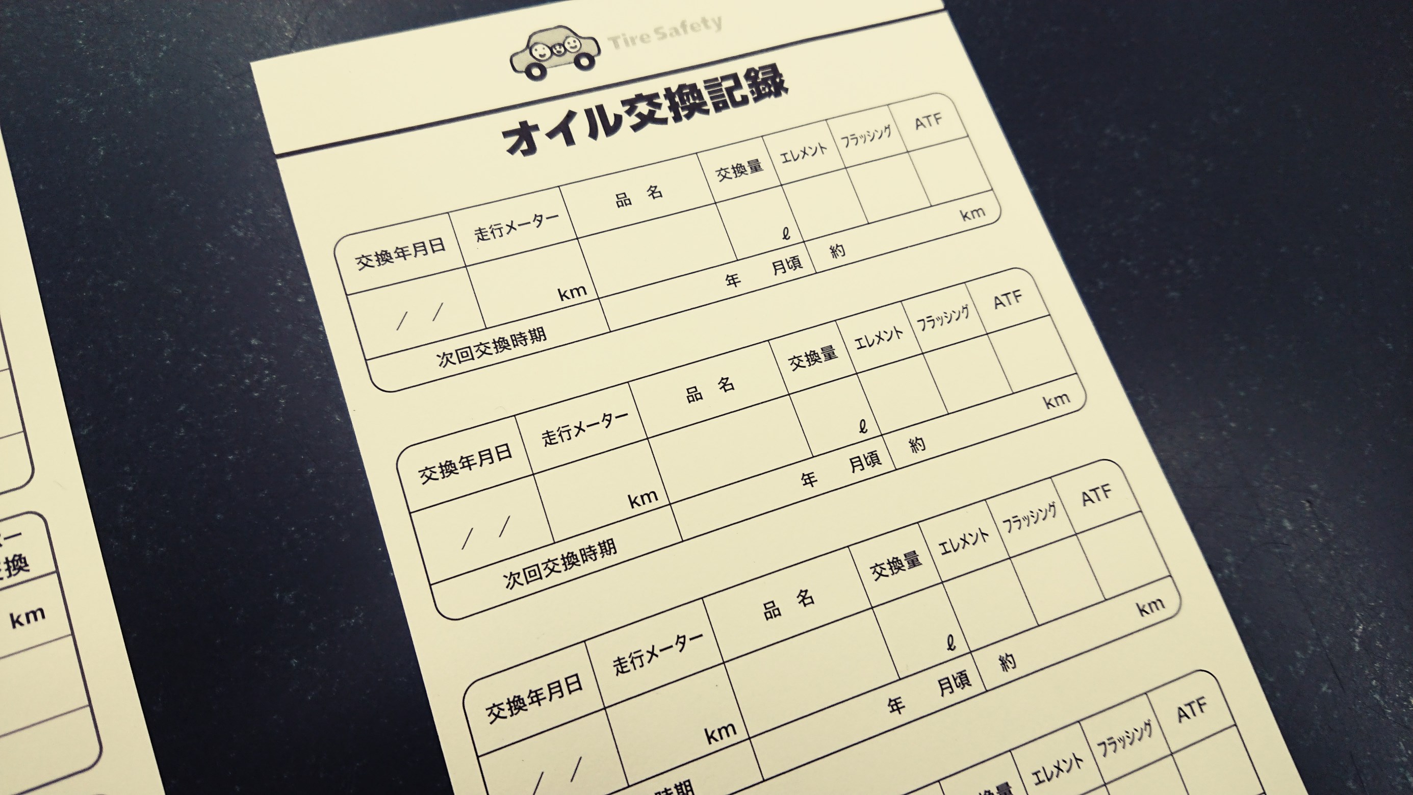 その他、タイヤ交換、オイル交換、その他メンテナンス品を交換した時にも記入してお渡ししています。
