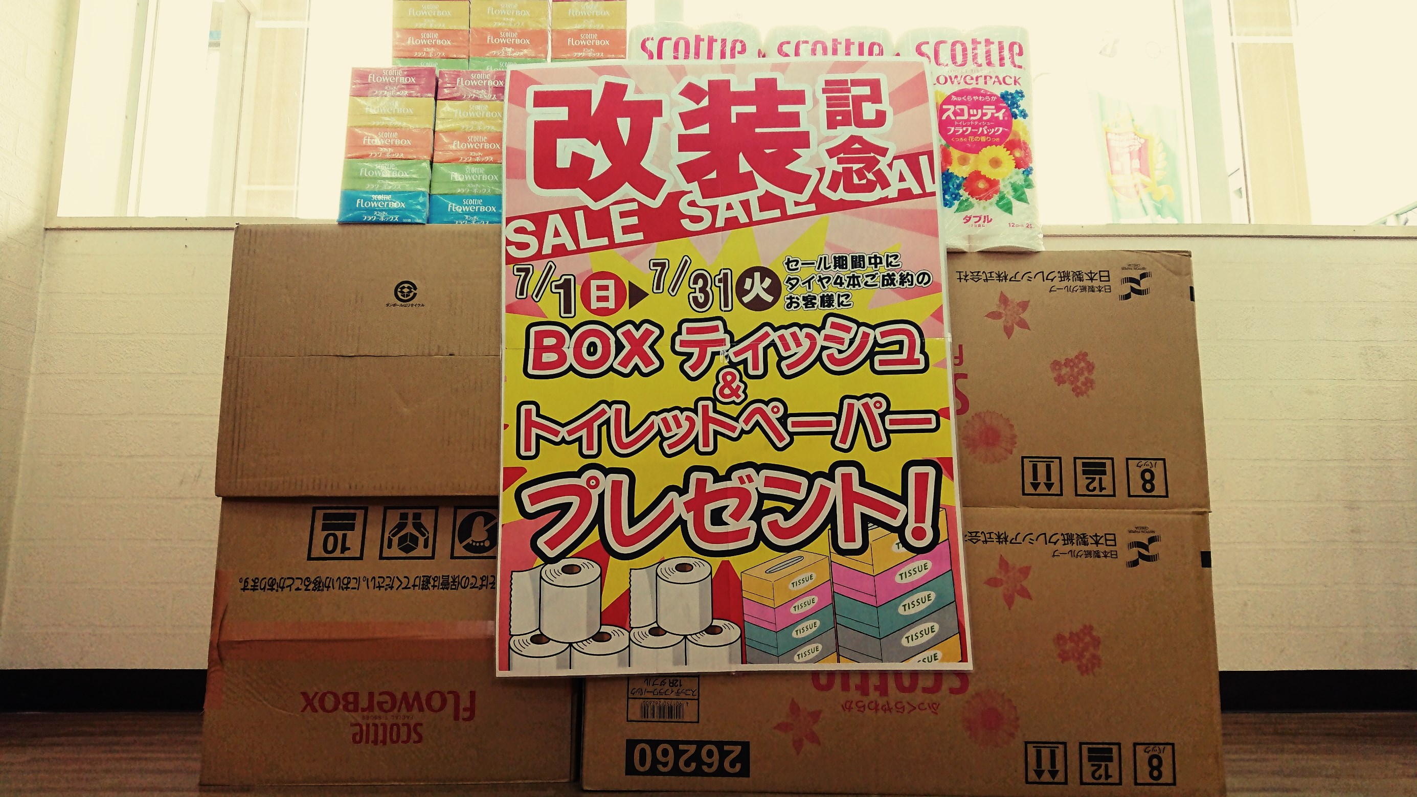 ひっそりと実施中なんですが只今、タイヤ4本ご購入して頂いたお客様にティッシュ&トイレットペーパー