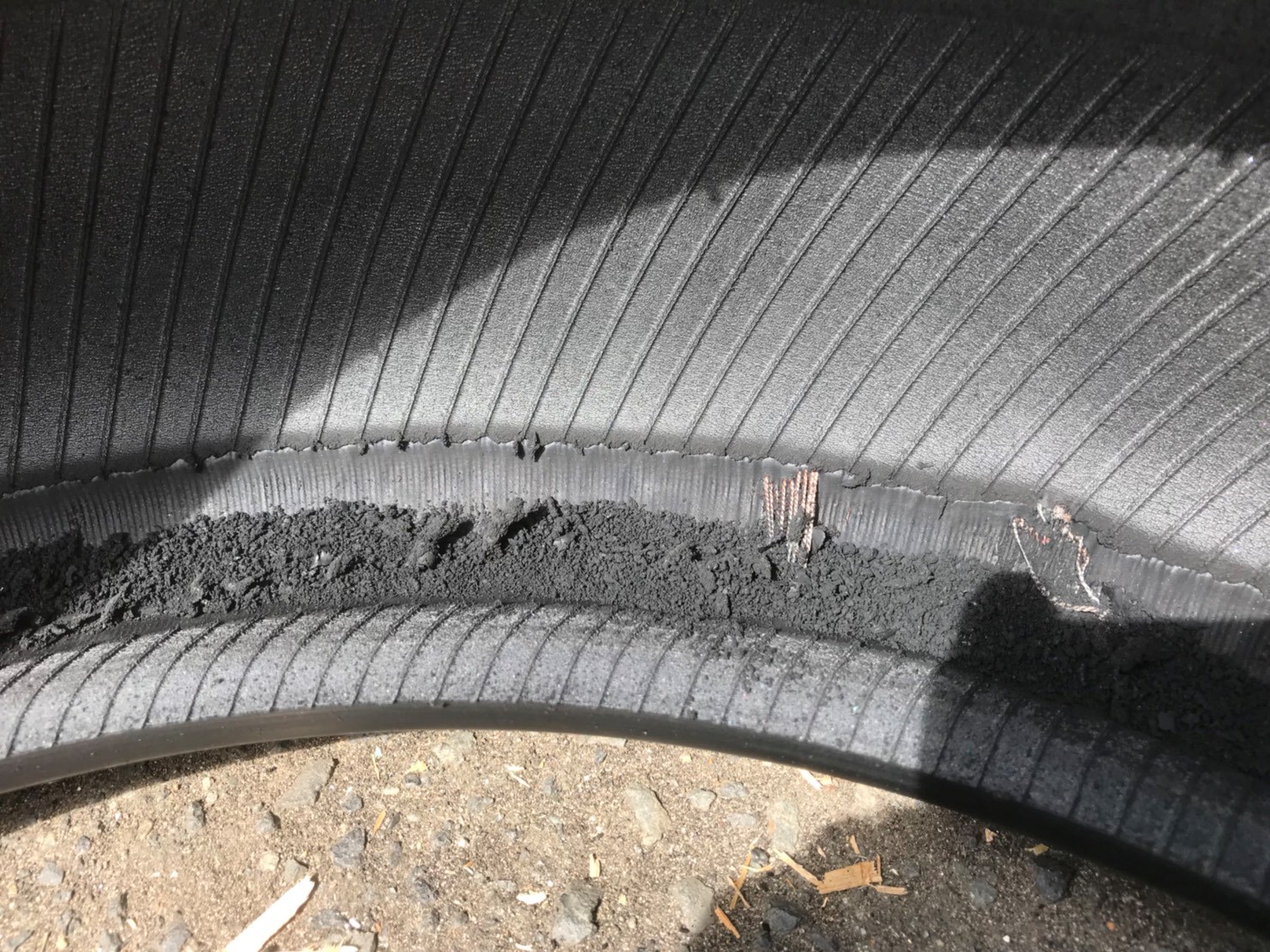 タイヤの内側の写真ですが、空気が抜けて走行してしまいタイヤに負荷がかかってしまったため、タイヤが削れ