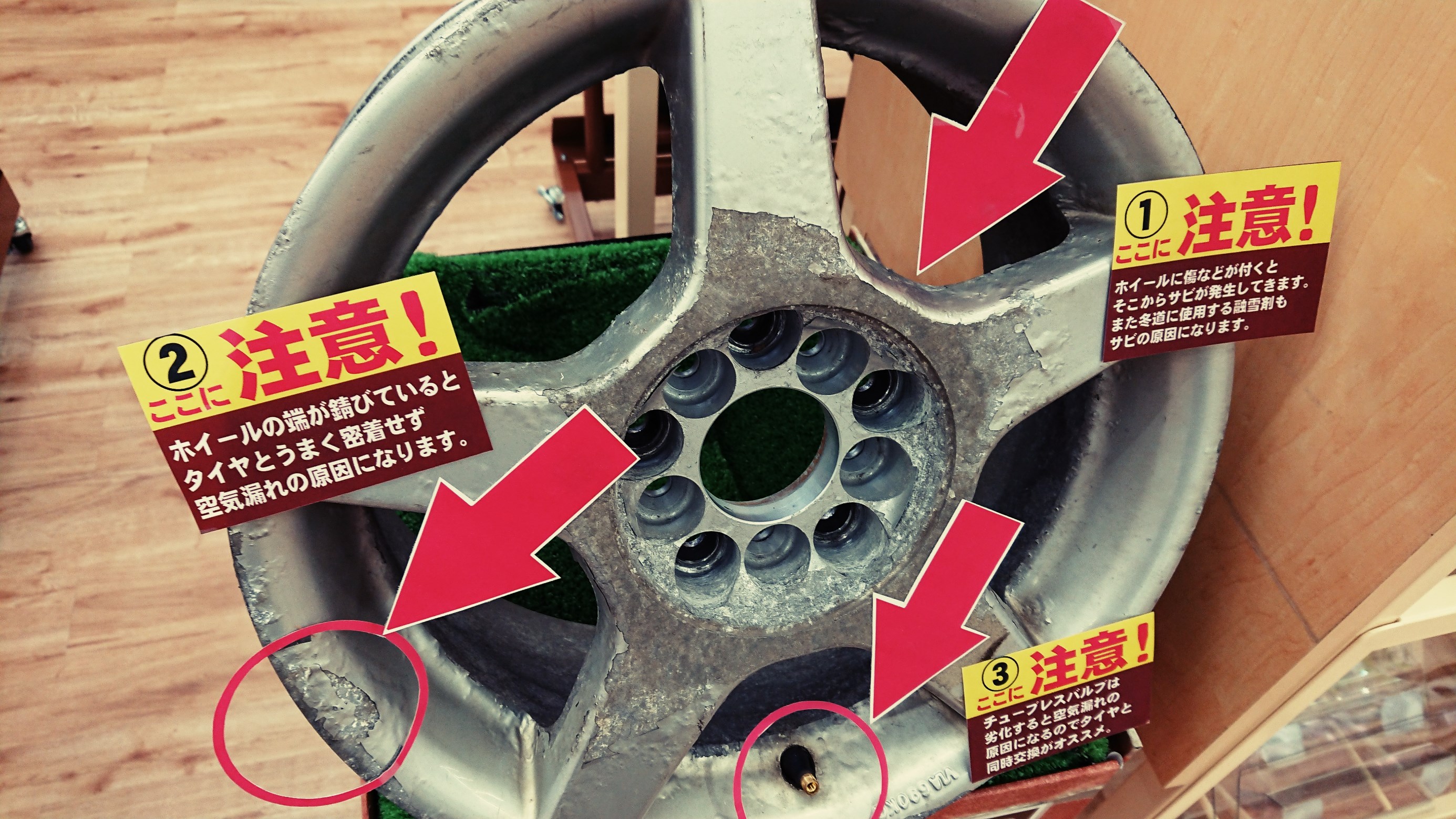 このようなホイールを装着しているとエア漏れなどの原因にもなり危険です!