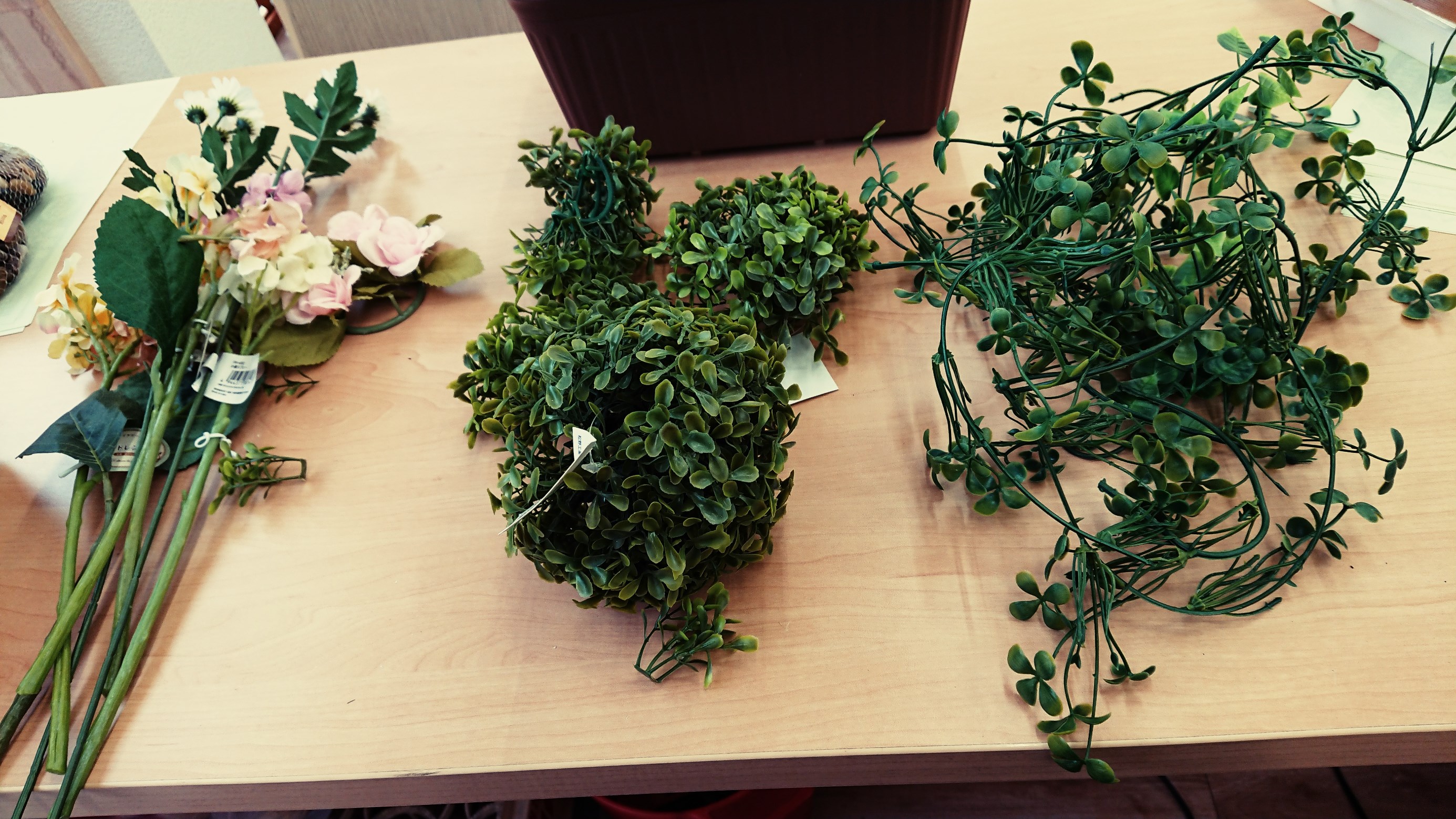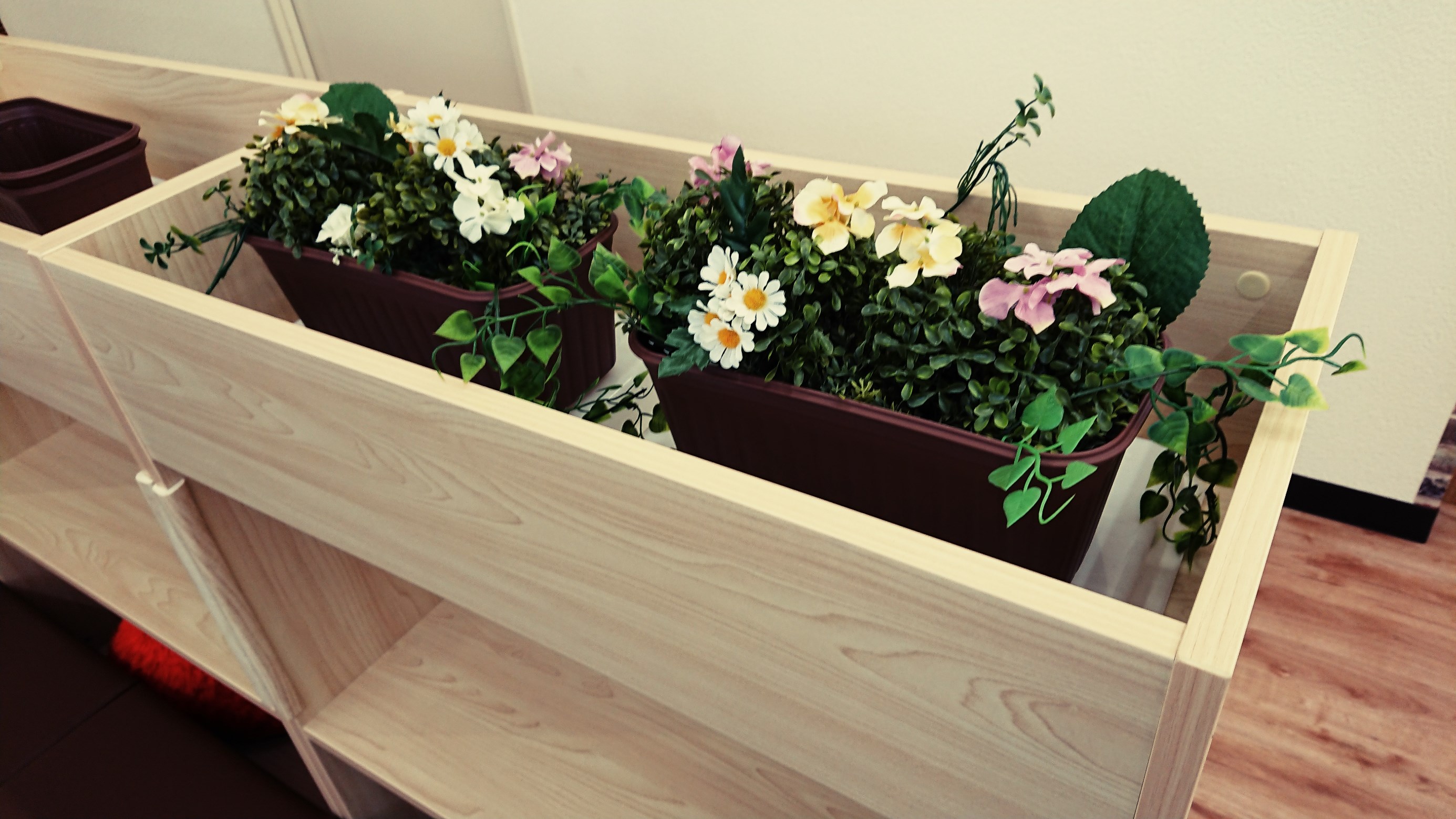 ちなみに本日は、インテリア用に100円ショップで鉢、造花を購入し華やかさをプラスしてみました。