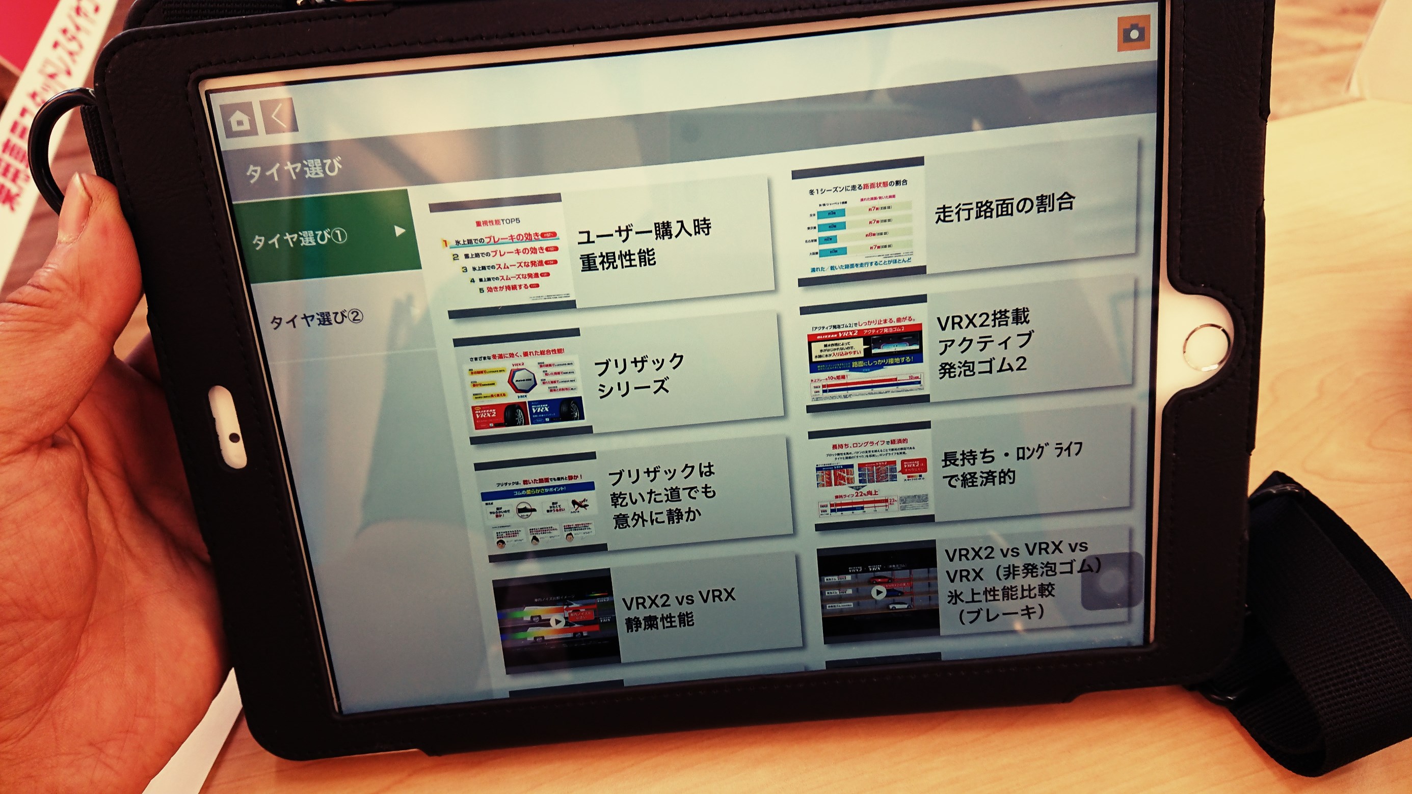 タブレットであればブレーキ性能の差や横滑りのしにくさなどを動画で見る事もできて、普通のポップ広告よりも