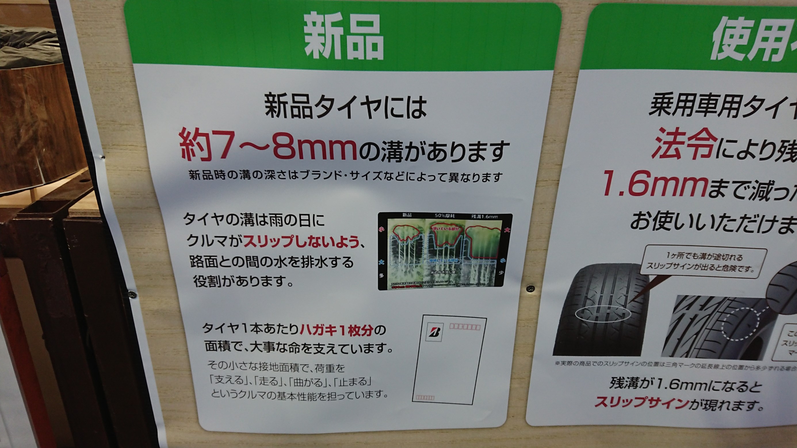 以前から店内にはタイヤ交換目安や異常摩耗したタイヤ例の展示をしていましたが