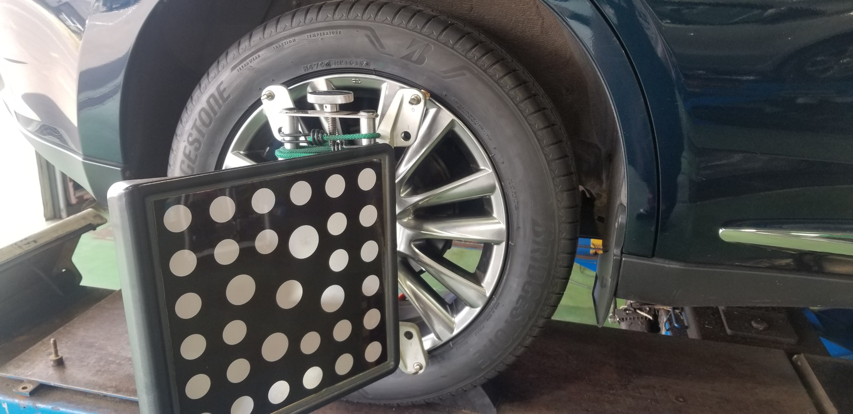 こちらは、アライメント。新品タイヤ交換と一緒に作業中。