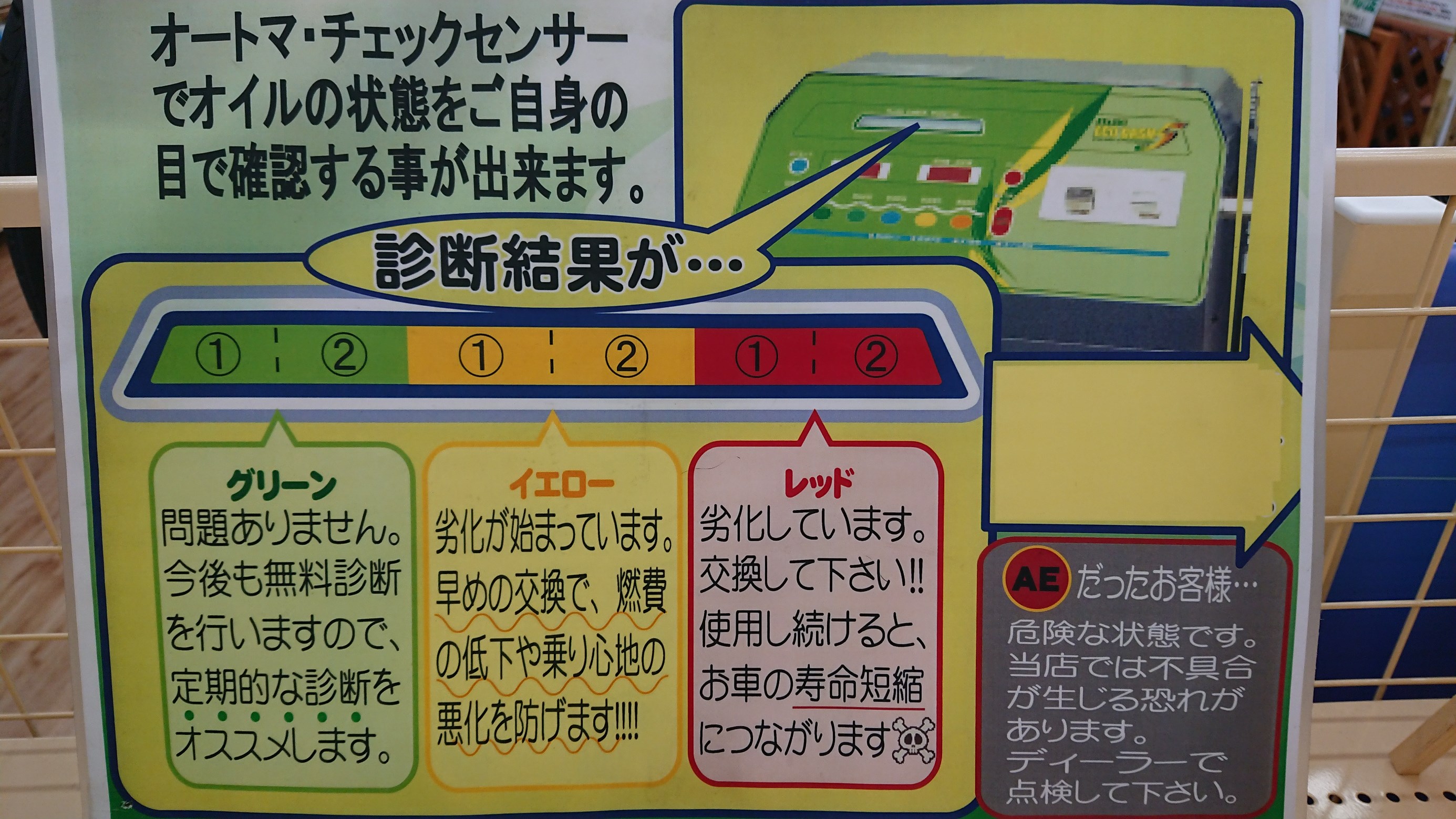 タイヤ館ではオイルの診断機で良好、注意、要交換、汚れが酷くて交換をオススメできないエラー診断の