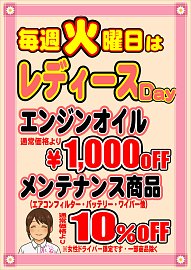 こんにちは 毎週火曜日は、 タイヤ館新発寒限定 “レディースディ” オイル交換がお買い得‼ 他、メンテナンス商品もお買い得‼ お車の点検も無料で行います タイヤ点検 オイル点検 エアコンフィルター点検 バッテリー点検 ワイパー点検 その他点検いたします お気軽にお越しください