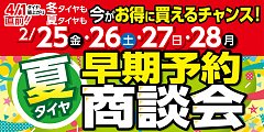 こんにちは(^o^)丿 タイトルにもある通り、2月25日(金)~2月28日(日)までの4日間限定で、 夏タイヤ早期予約大商談会を開催致します!! 4日間だけのお得なSALEとなっております(^O^)/ 値上がり前の「今」がお得に買えるチャンスです! この期間、タイヤ4本お買い上げのお客様には...