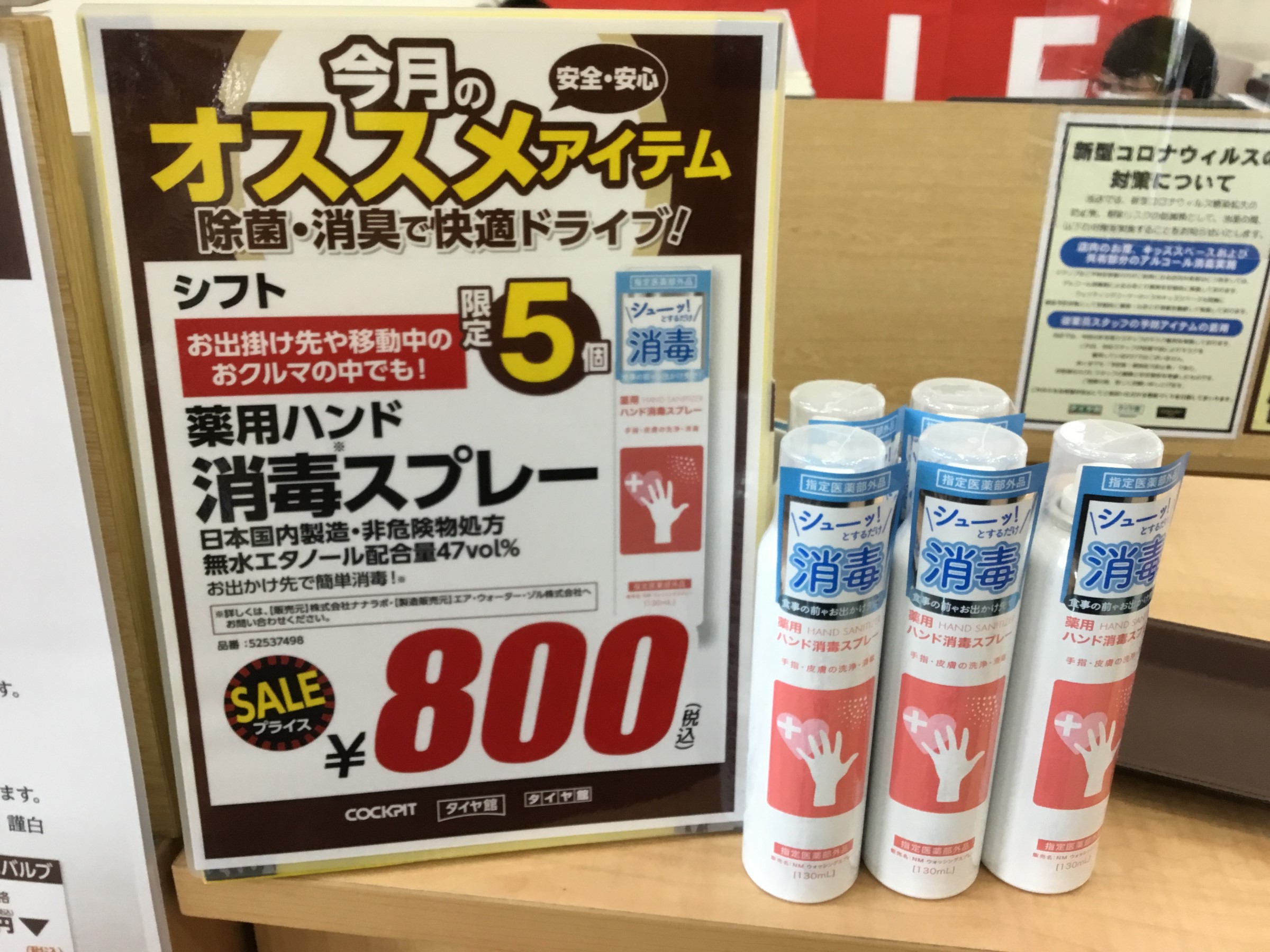 当店でも消毒、除菌グッズを取り扱いしております!! ポスト 2020年7月13日 こんにちは! 最近は消毒、除菌が気になっていると思っていませんか? 当店でも消毒、除菌グッズを取扱いしました!! 日頃から手洗いや除菌など気を付けていると思いますが、出先や車の中でも除菌出来たら便利ですよね(^^) スプレー以外にも、 置き型タイプもありますので、ご来店の際には是非ご覧になってください!! 担当:佐藤