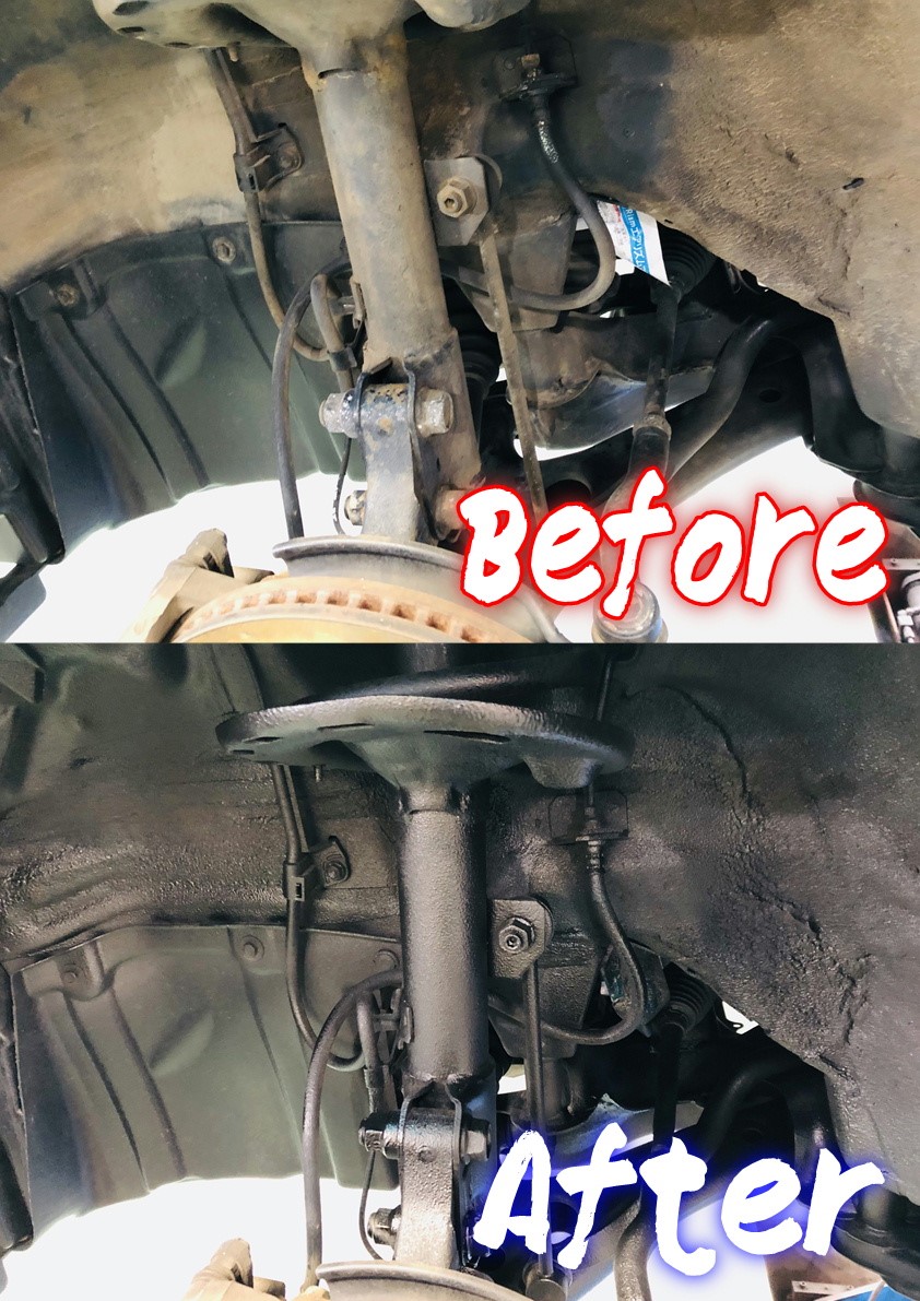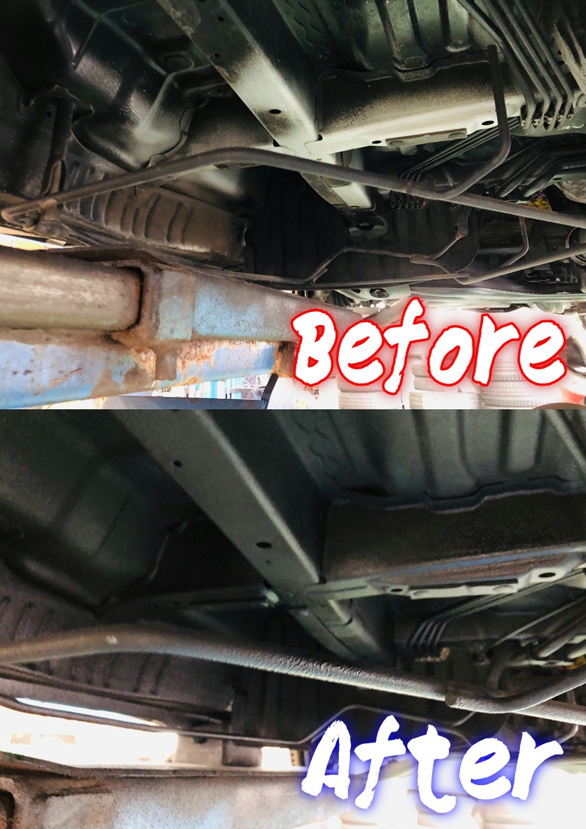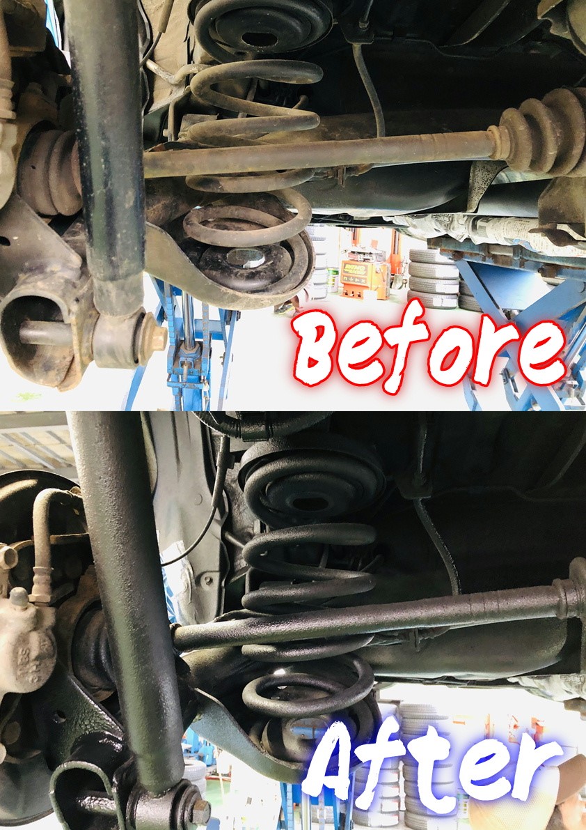 ③2日目➡塗料施工(マフラー塗装➡マフラー養生➡ブラック塗料で下回り塗装)