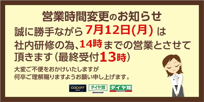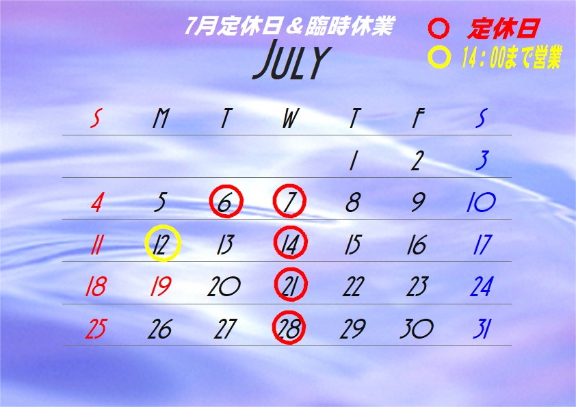 7月定休日&営業時間短縮のおしらせ ポスト 2021年7月1日 どーもジャイアンです★ 今日から7月ですね。。。 ちょうど転勤して半年がたちましたが、 早い!!!早すぎる!!! 残りの半年は充実した毎日を過ごす事を心がけます。笑 さて、7月の定休日は変動定休日があり、営業時間短縮の日もありますのでご注意ください お間違えの無いようご注意ください。 担当:G