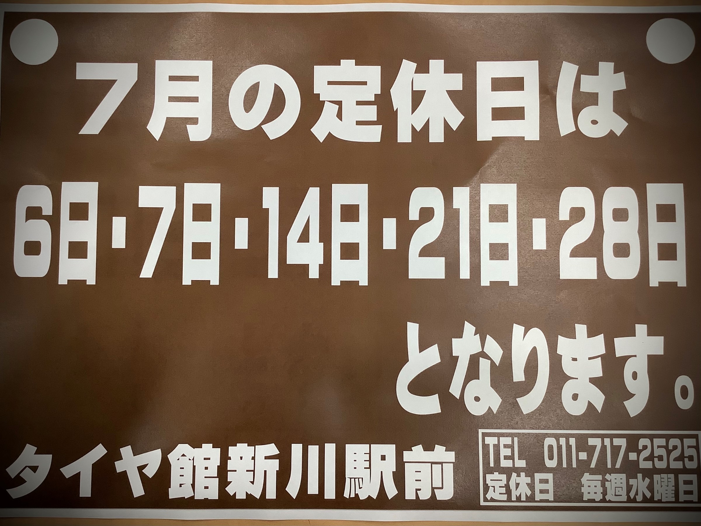 臨時休業のお知らせ ポスト 2021年7月5日 いつもブログをご覧いただきありがとうございます。 最近は気温も高くもう夏ですね!! 熱中症には気を付けていきましょうね!! お知らせです。 7月6日(火)は定休日となっておりますので お間違えの無いようお願い致します。 今月の定休日はこちらになっております!! ご迷惑お掛け致しますがよろしくお願いいたします!! 担当:久米