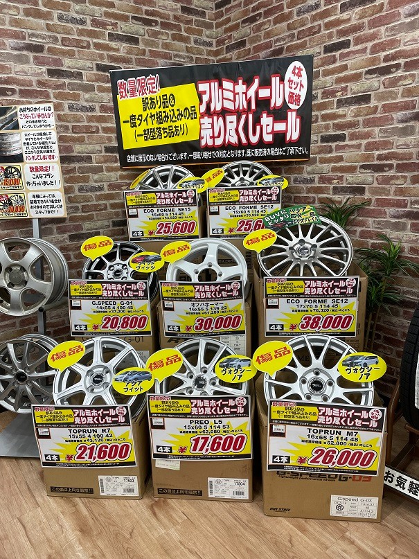 アルミホイール在庫処分セール開催中! ポスト 2021年8月3日 こんにちは(^^) いつもブログをご覧いただきありがとうございます。 当店では只今アルミホイール在庫処分セールを開催中です。 組込品・傷品などの訳あり品を処分価格でご提供! スチールホイールを装着の方や腐食などでエア漏れが気になる方は この機会に是非買い換えをおすすめします。 皆様のご来店をお待ちしております。 担当:よしだ