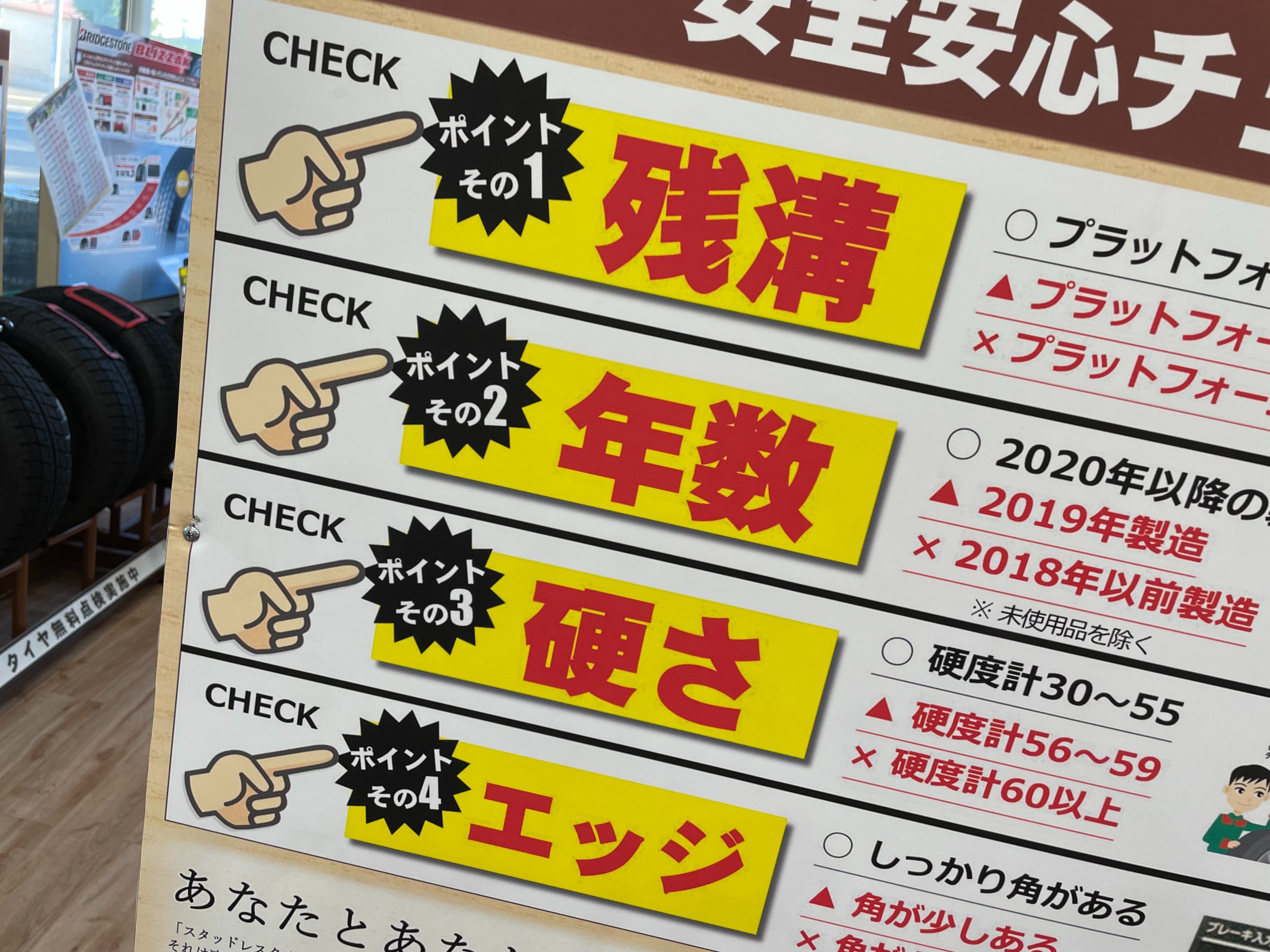 プロの目でしっかりと点検を!! ポスト 2021年9月18日 どーもジャイアンです★ みなさん今年ご使用予定の スタッドレスタイヤの状態はどうですか?? 当店は、この4つのポイントで点検させて頂いております♪ 1つでも当てはまれば、交換を検討頂いた方がよろしいかと思われます 4本じゃなくてもいいです! 1本でもいいのでお持ちください!! 専用工具で無料点検させていただきます♪ 担当:G