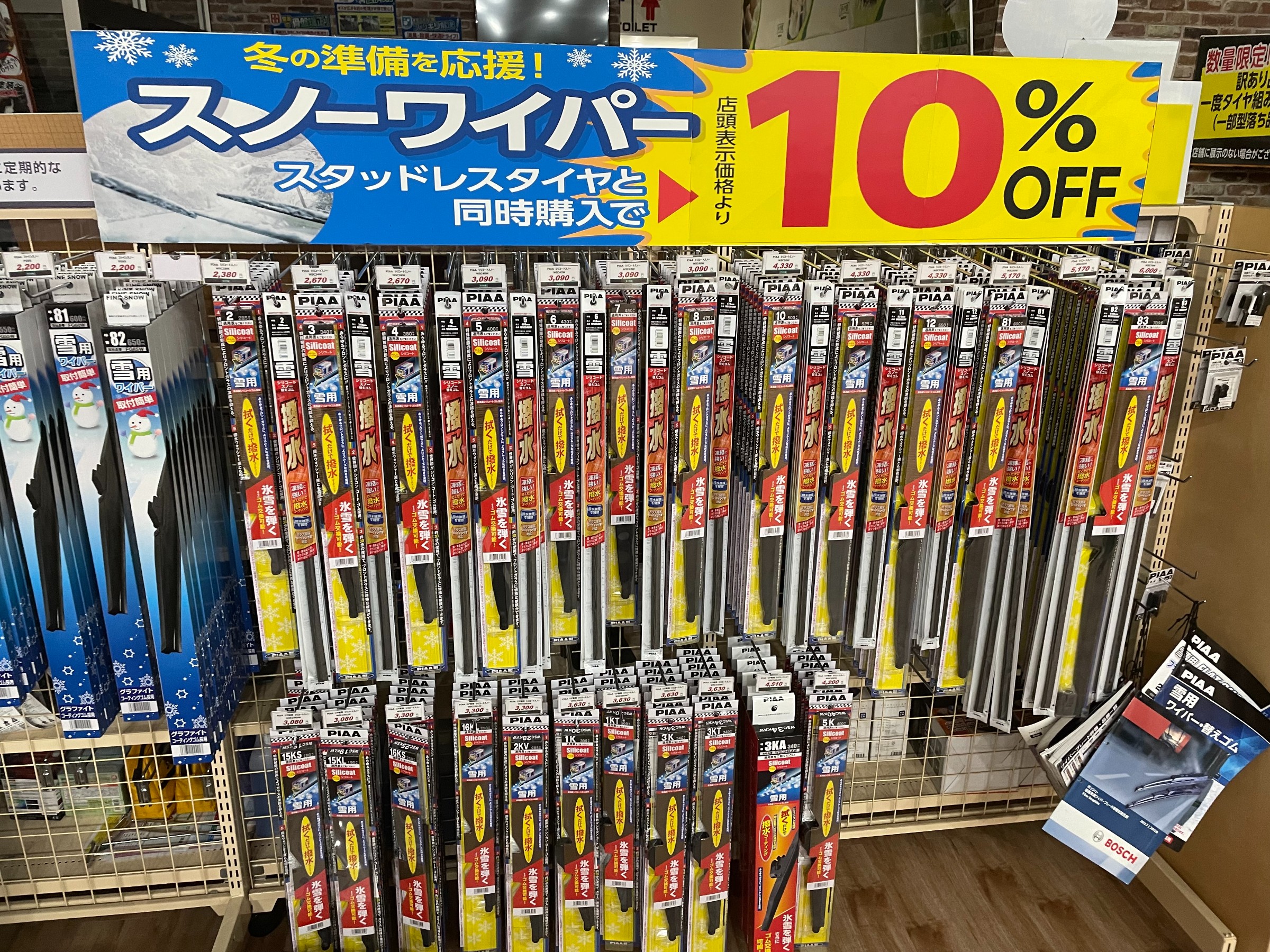 撥水ワイパー大放出!! ポスト 2021年11月13日 どーもジャイアンです★ 只今、スタッドレスタイヤと同時購入で、 PIAA製の「撥水ワイパー」が、店頭表示価格より10%OFF!!!!! 冬こそ撥水ワイパーで視界良好♪ 猛吹雪の時など、きっと、撥水ワイパーでよかったと思えるはずです♪ 冬支度、タイヤだけではなく ワイパーやサビ止めなど タイヤ交換と一緒にいかがですか?? たくさんのご来店心よりお待ちしております♪ 担当:G