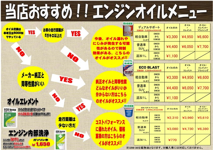 オイル交換やってます! ポスト 2022年1月14日 こんにちは(^^) いつもブログをご覧いただきありがとうございます。 タイヤ館ではタイヤ以外にもエンジンオイル交換もやってます。 最近、あまり車に乗らないからと言って車検時にしかオイル交換を してないという方が多いですが、使用頻度が少なくても酸化により 性能が低下してしまうので、少なくても半年に一度は交換をしましょう。 詳しくは当店スタッフまでお気軽にお問い合わせください。 担当:よしだ