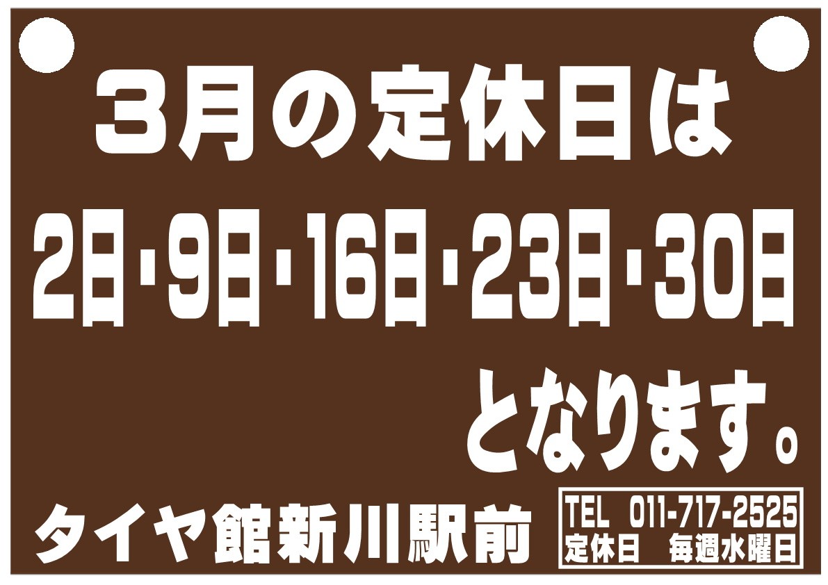 3月の定休日のご案内です! ポスト 2022年3月1日 こんにちは(^^)/ いつもブログをご覧いただきありがとうございます。 時が経つのは早いもので、今日から3月に突入です! 今年は 4月1日より、夏タイヤも冬タイヤも値上がりしますので タイヤをご購入予定のお客様はお早めにご来店くださいますようお願い申し上げます。 今月の定休日は下記の通りです。 たくさんのご来店お待ちしております。 担当:よしだ