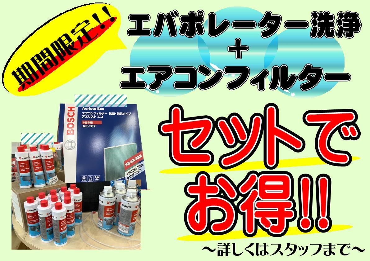 ☆お得な商品のご案内☆ ポスト 2022年6月3日 こんにちは(^^)/ 今月のイチオシ商品のお知らせです!! こちらです!(^^)! これからエアコンを使う機会が増えると思うので 1度、綺麗にしませんか? エアコンから嫌な臭いがすると感じるお客様!! 是非、お得なこの機会に臭いの元を洗浄しましょう(^^)/ 料金、作業時間はスタッフまでお問い合わせください! 皆様のご来店お待ちしております♪ 担当:山内