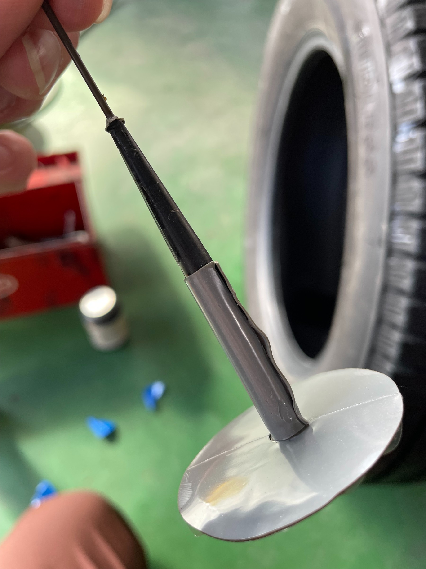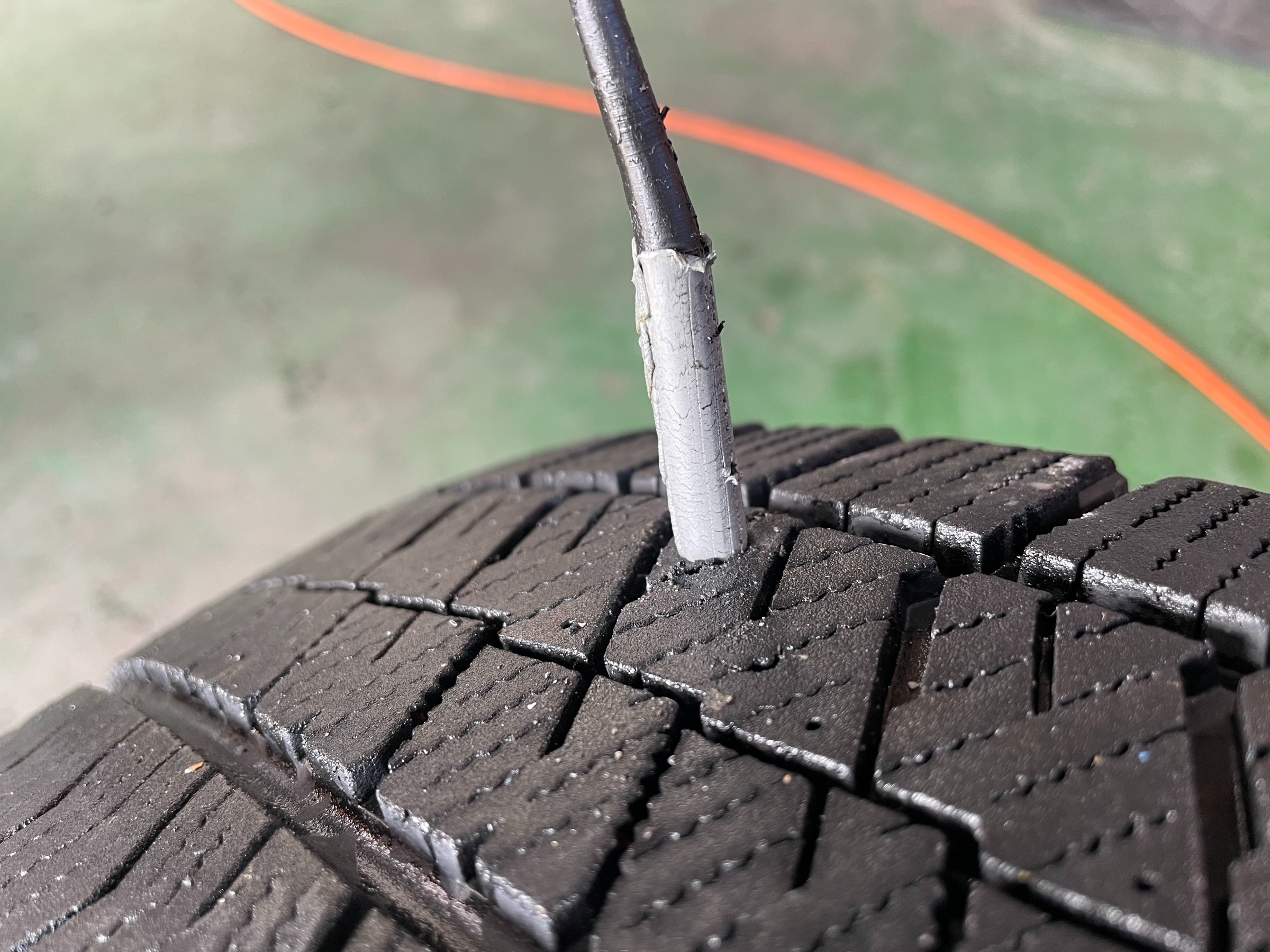 こうすることで、タイヤ溝の摩耗で修理剤が削れても、内側からパッチを
