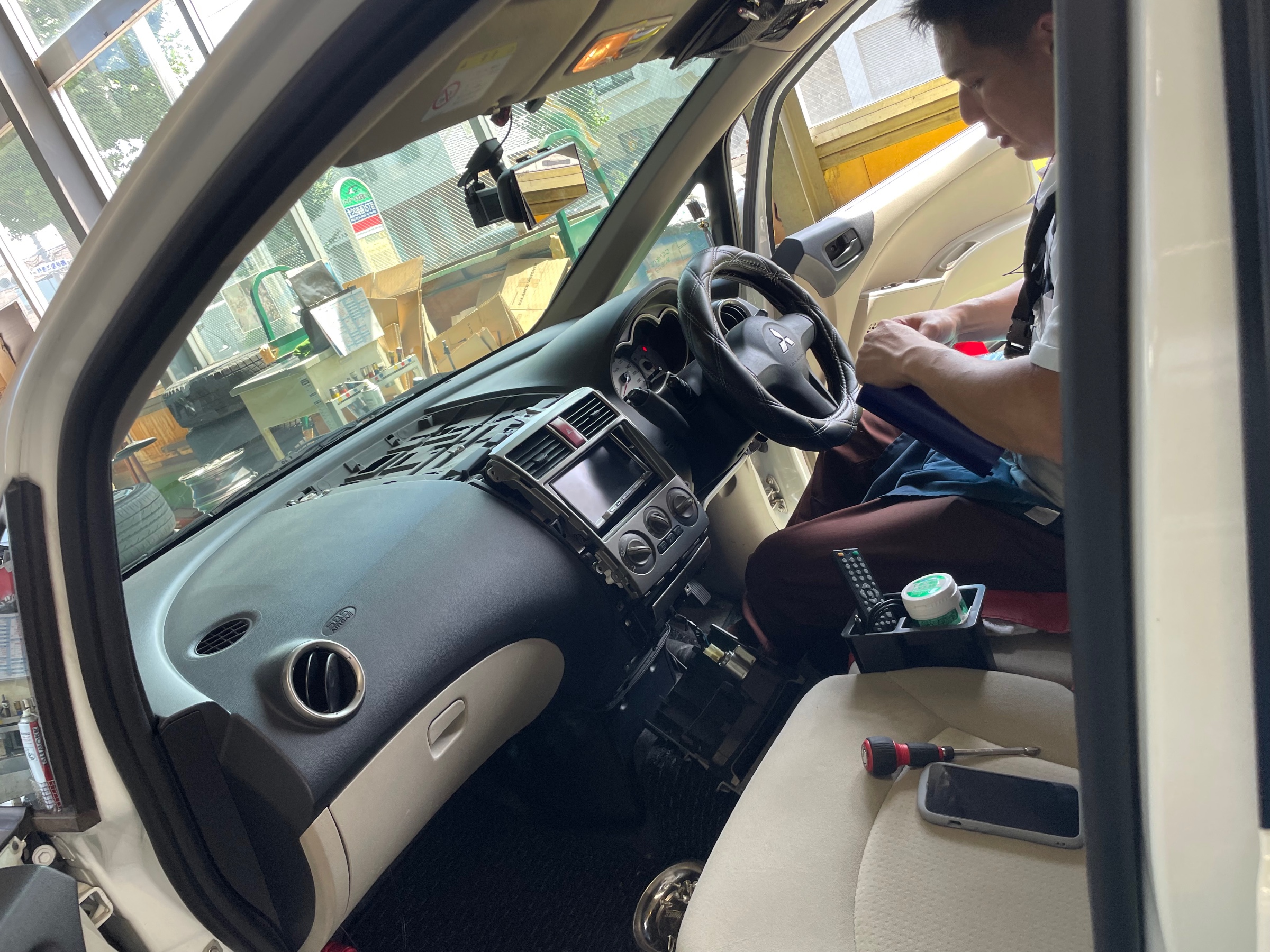 三菱コルトのエクリプスのナビを佐々木スタッフが取り付け中!