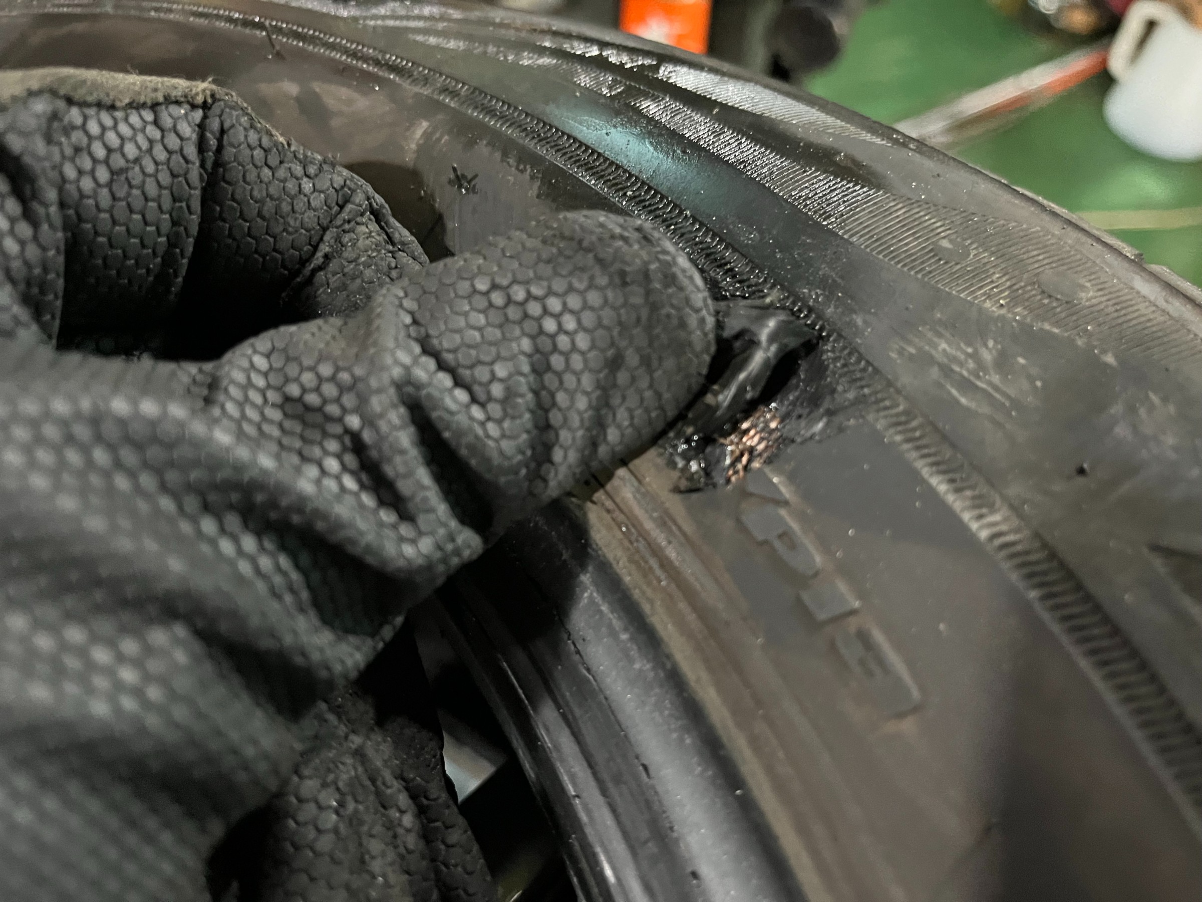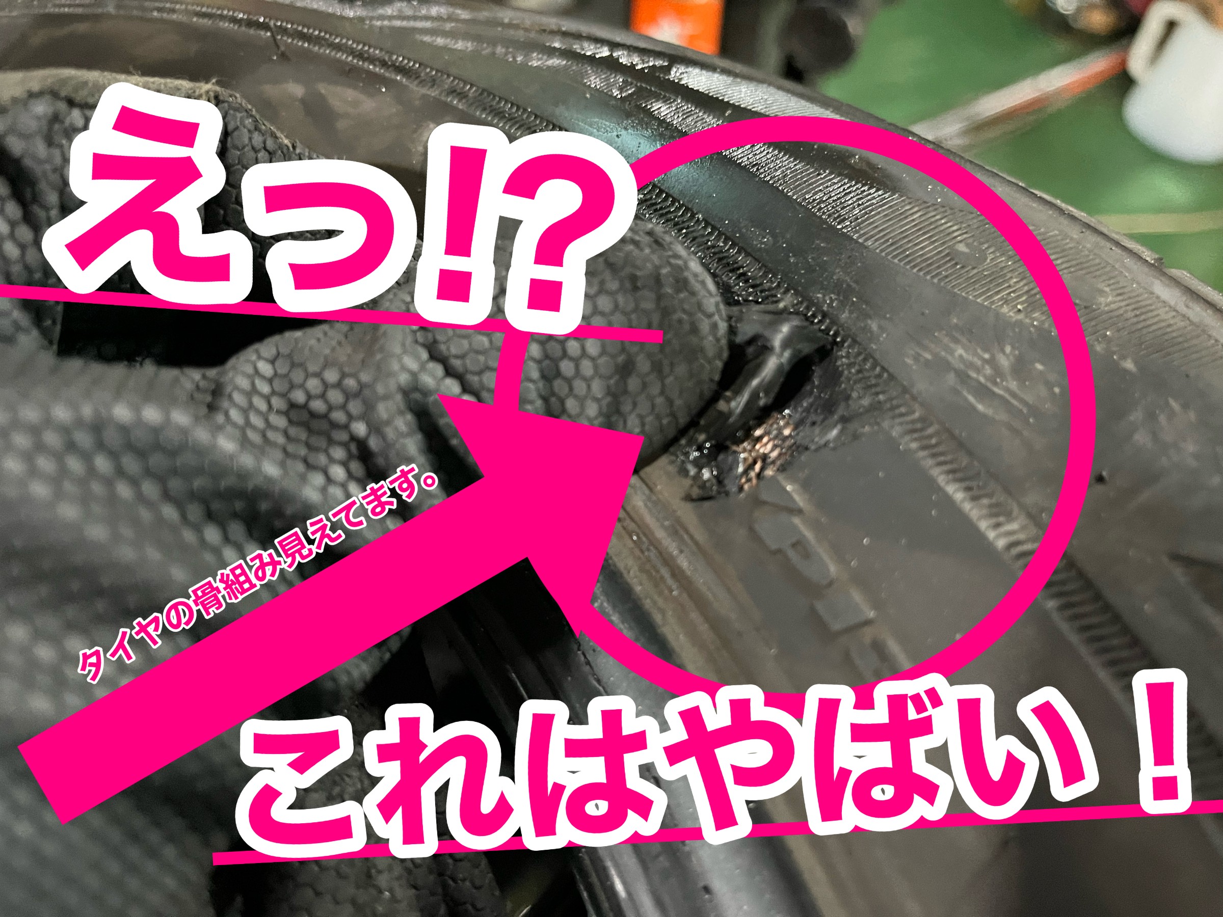 しかも、かなり深く、タイヤの骨組みが見えているではありませんか!!