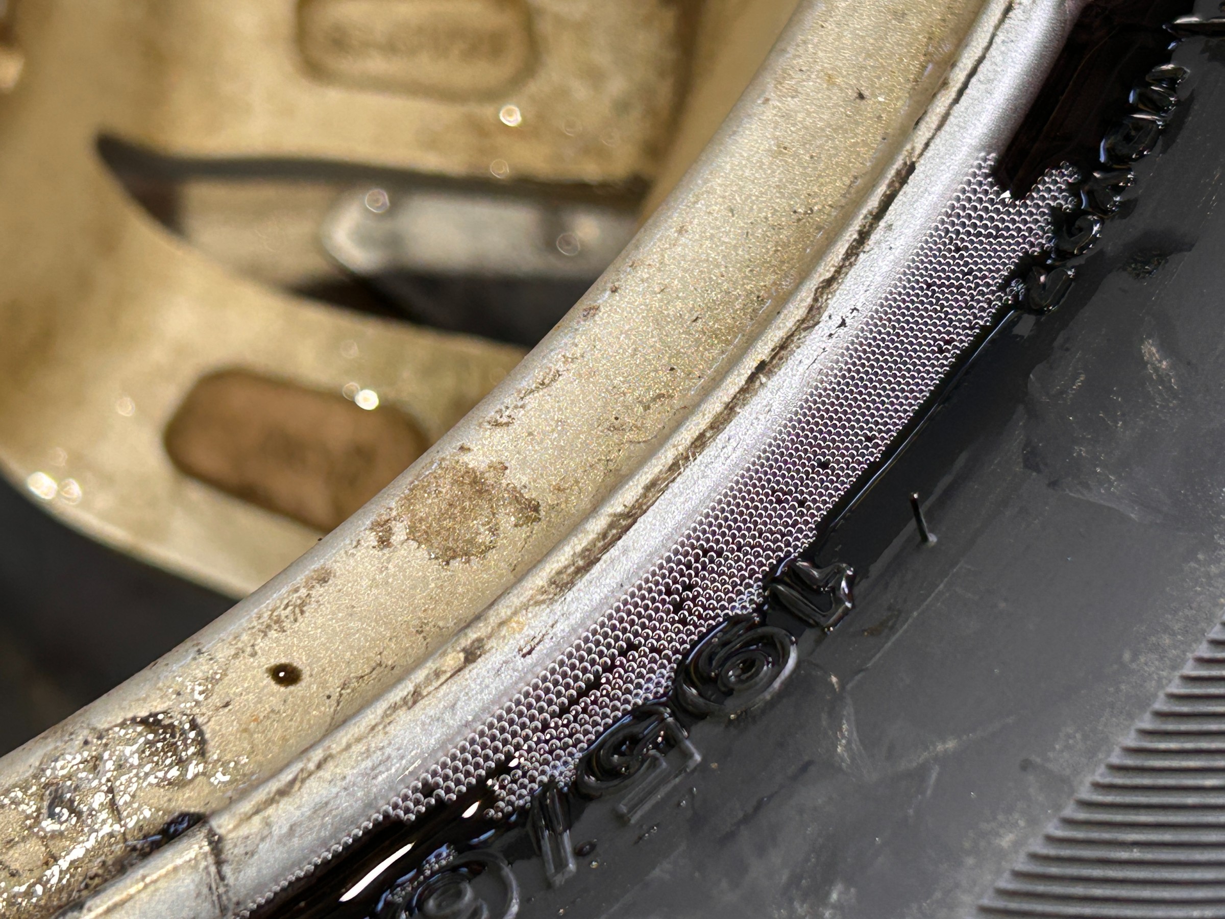 すると、ホイールの隙間からぶくぶくと空気が漏れてきました。