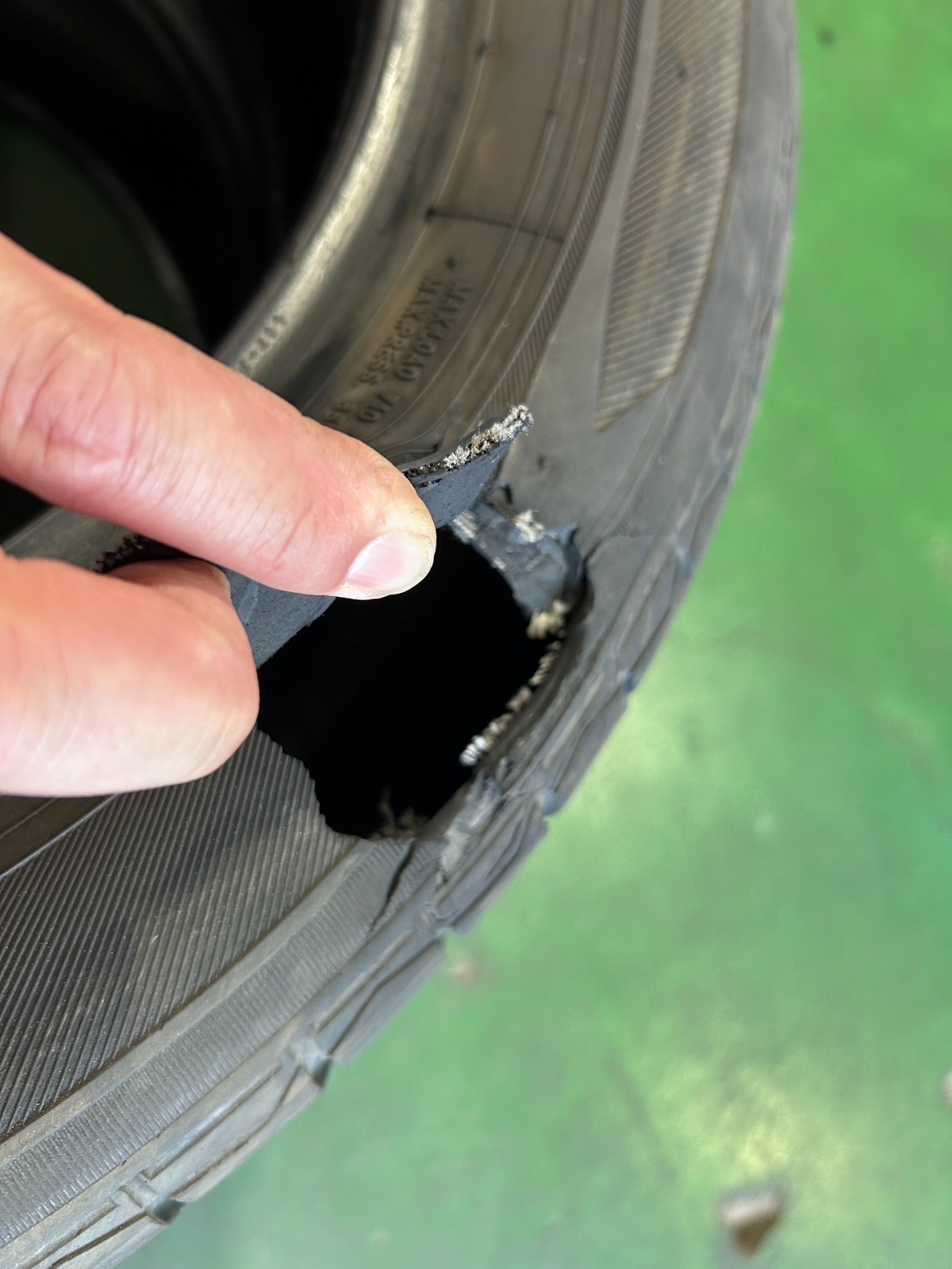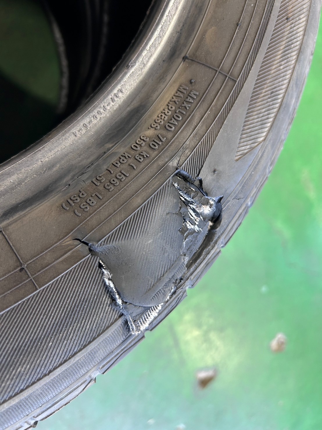 縁石にタイヤをぶつけてしまいバーストしてしまったようです。