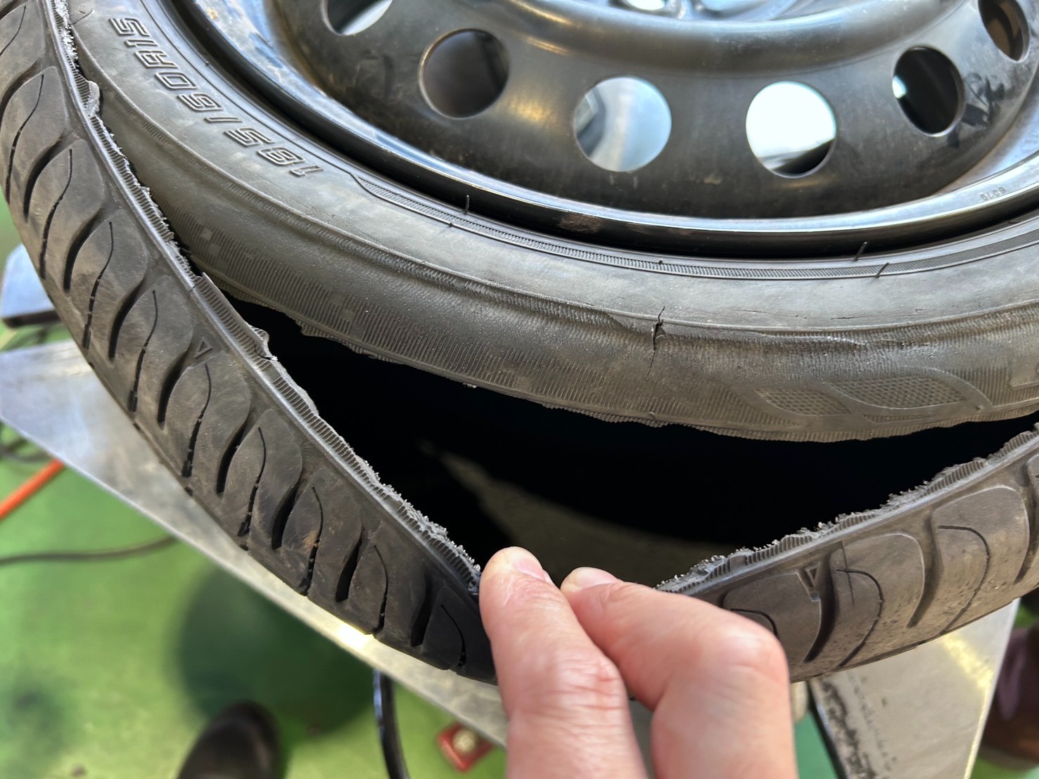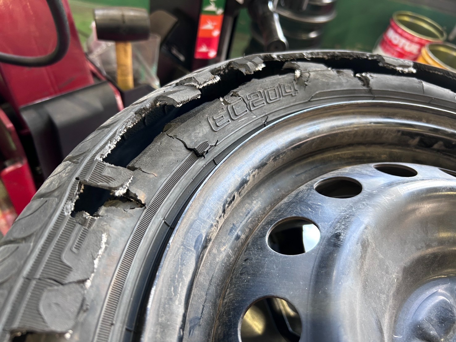 タイヤが裂けてしまい、ホイールで走行している状態でした。