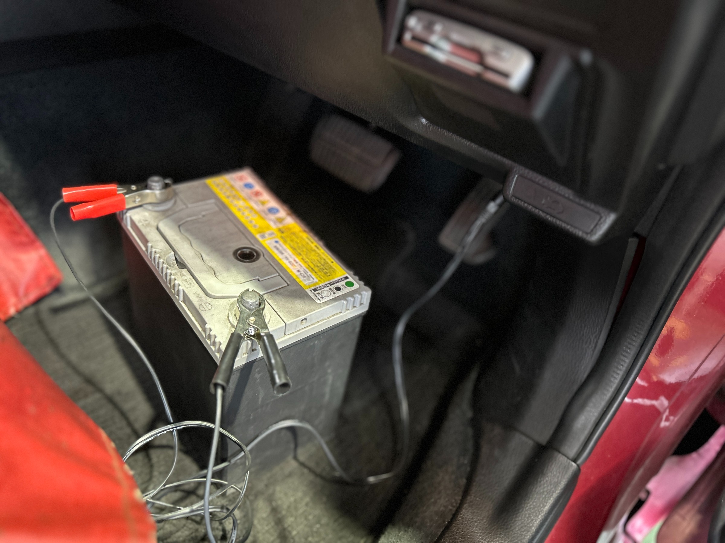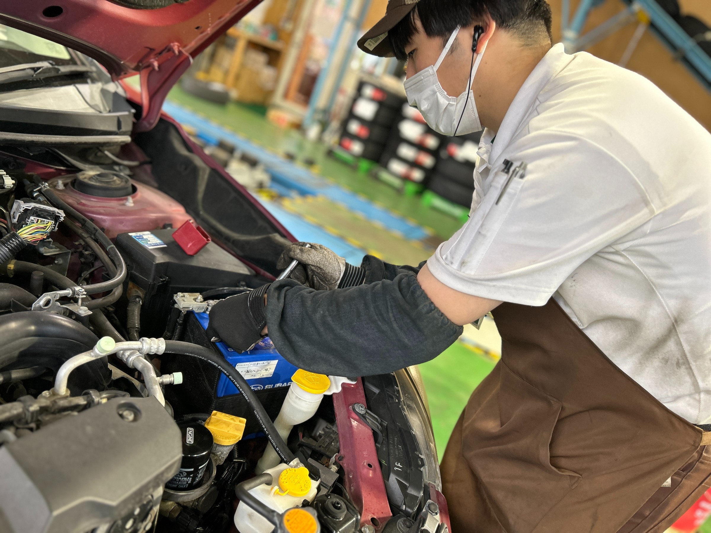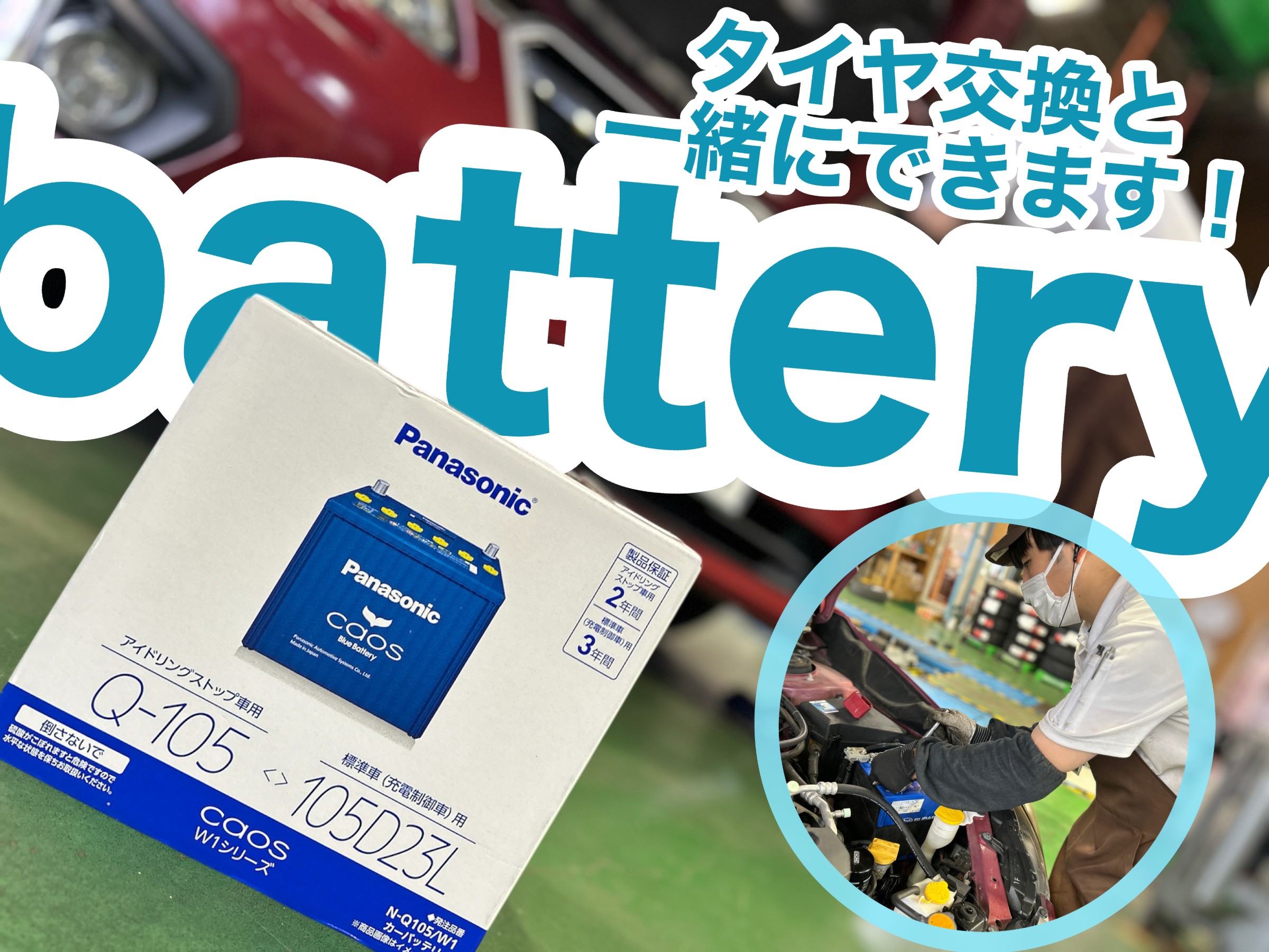 タイヤ交換時の安全点検でバッテリーを点検し、