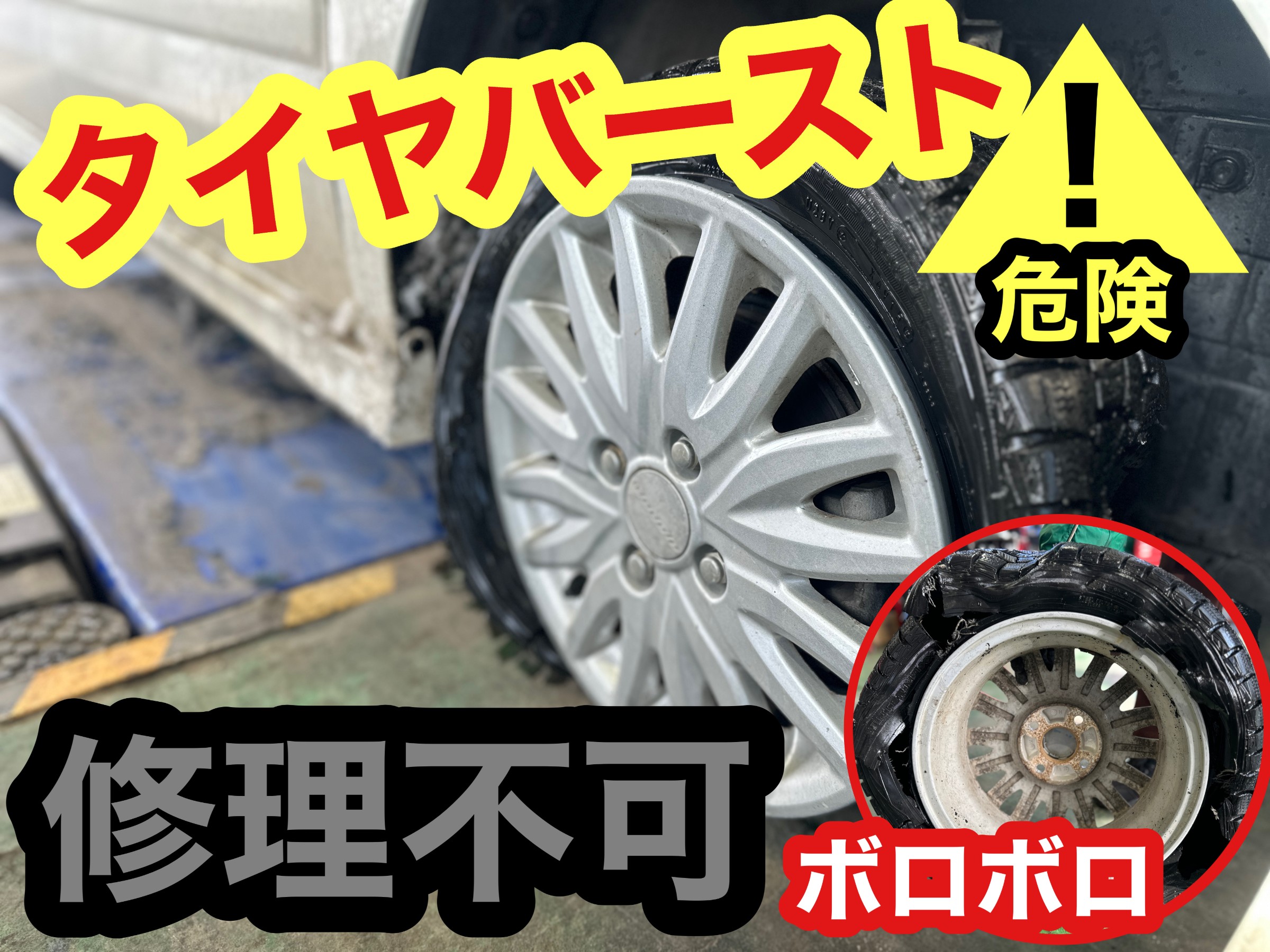 走行中にバースト(パンク)してしまい、