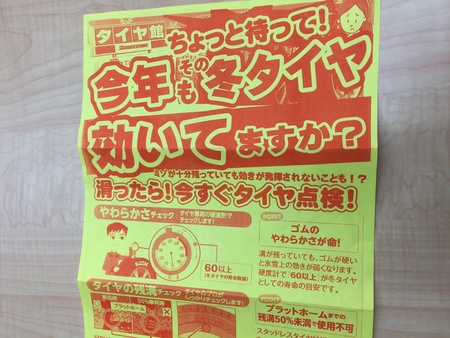 本格的に雪が降る前に一度タイヤ点検をしてみませんか? ポスト 2016年11月30日 いつもタイヤ館をご利用いただきありがとうございます!ようやく雪も降り積もり、路面が滑ると感じる機会も多くなったのではないでしょうか?タイヤ館ではいつでも無料でタイヤ点検を行っておりますので、この機会にぜひタイヤのやわらかさチェック、残溝チェックをしてみませんか?当店スタッフにいつでもお声掛け下さいませ!お客様のご来店心よりお待ちしております! 担当:中村