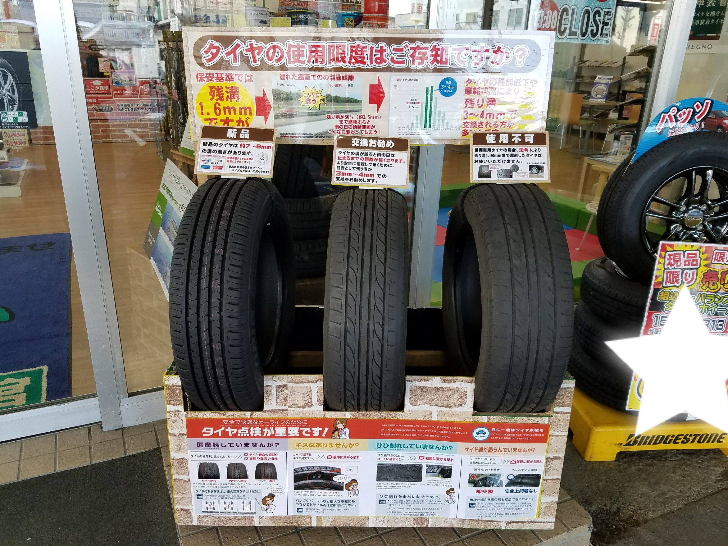 タイヤの交換時期、使用限度が一目で分かるコーナーです!