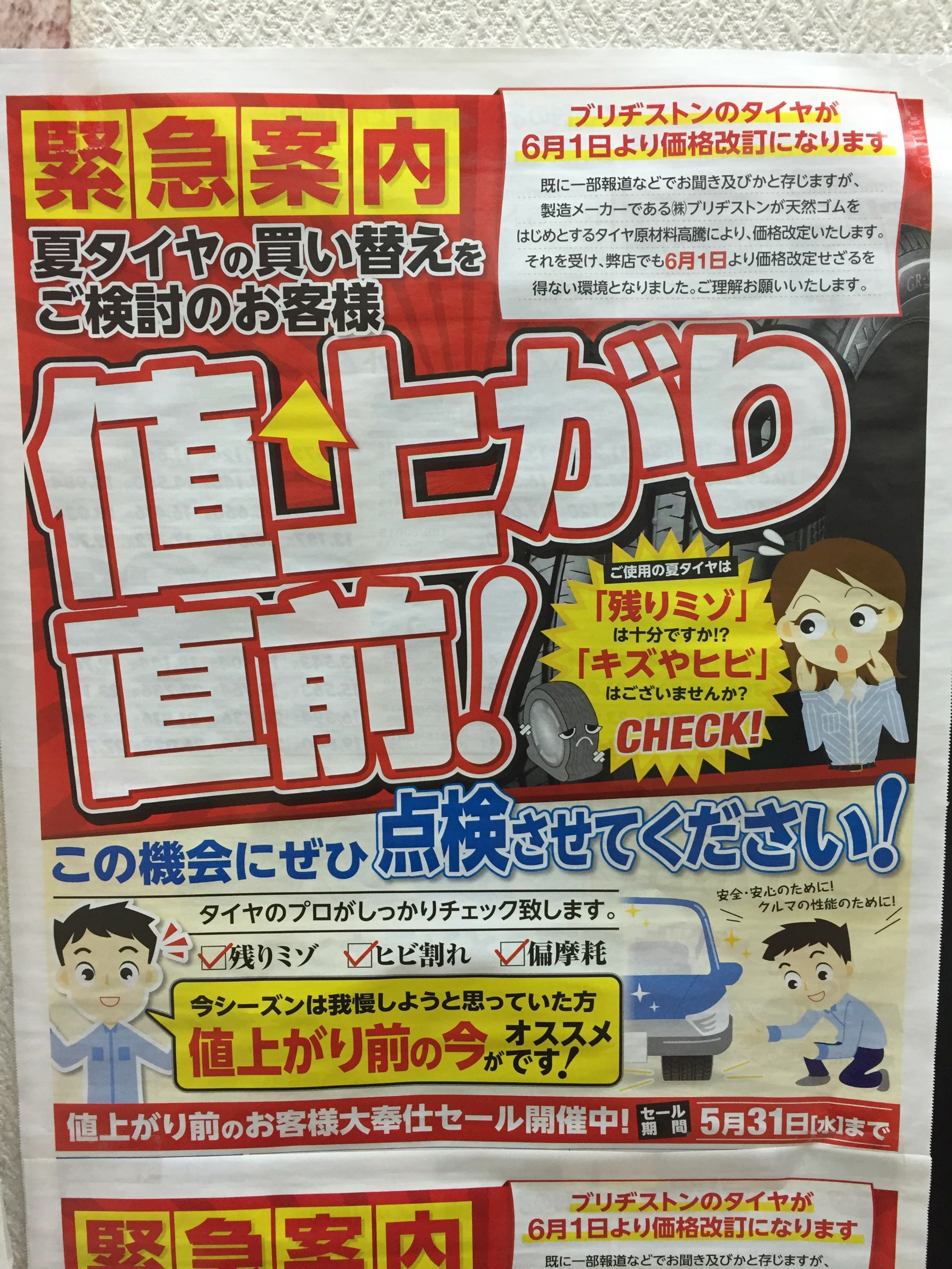 タイヤ館では値上げ前に大奉仕セールを開催いたします!!