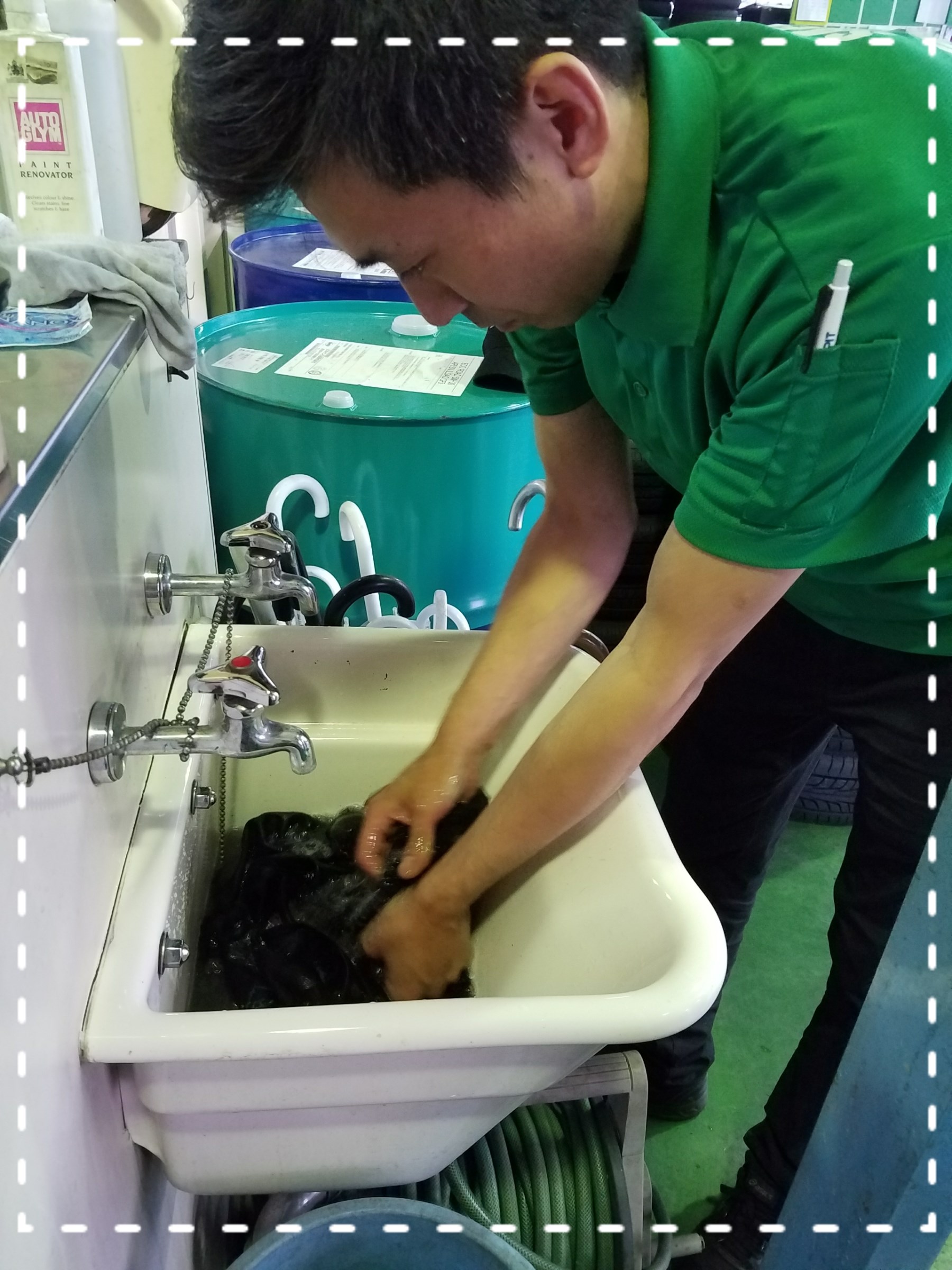 ピットで自分のエプロンを手洗いしてました。笑