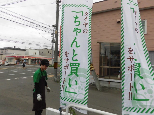 作業の合間に外ののぼりを変えている中村スタッフ!