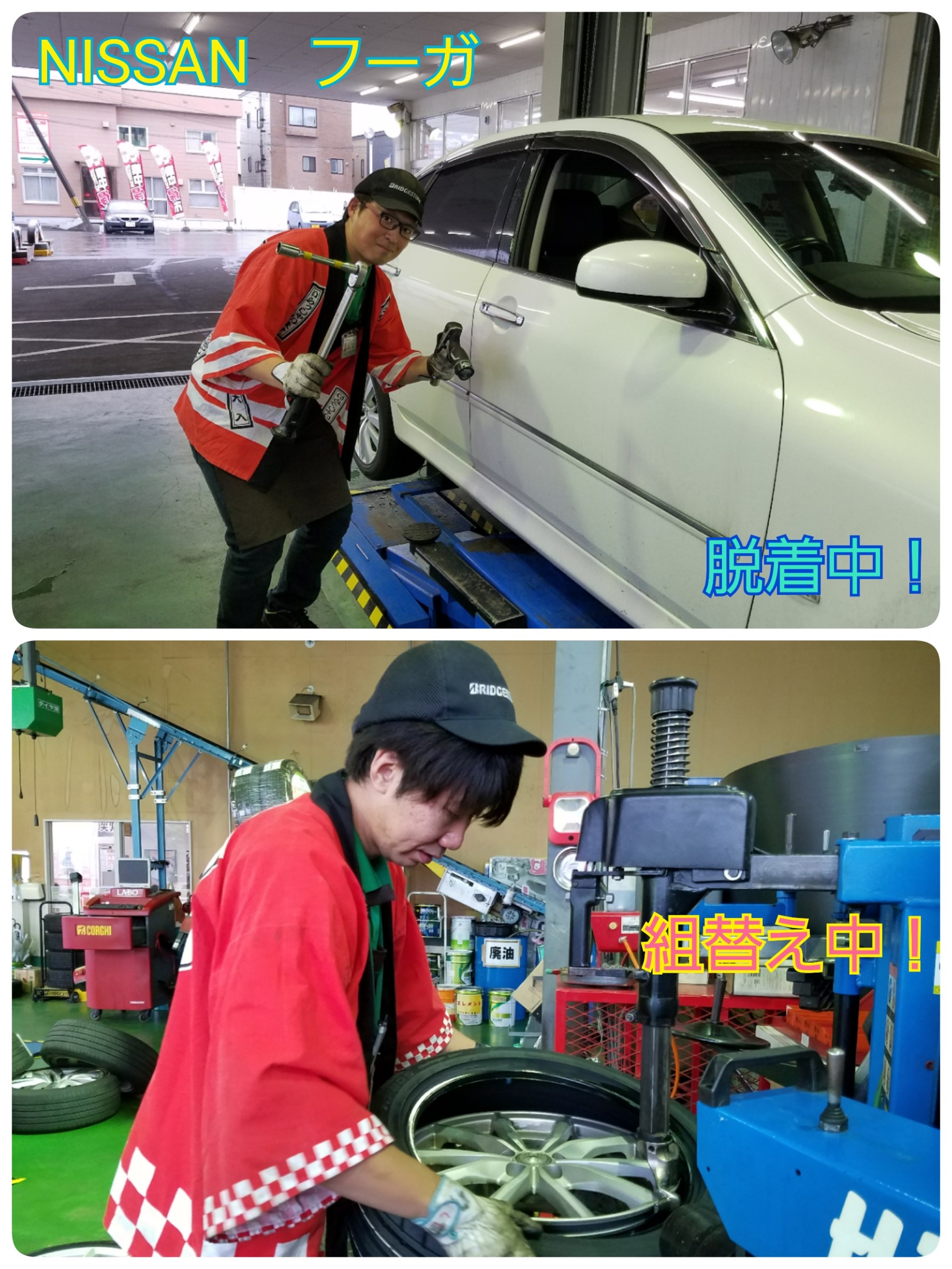 フーガのタイヤ交換作業中の佐藤スタッフと
