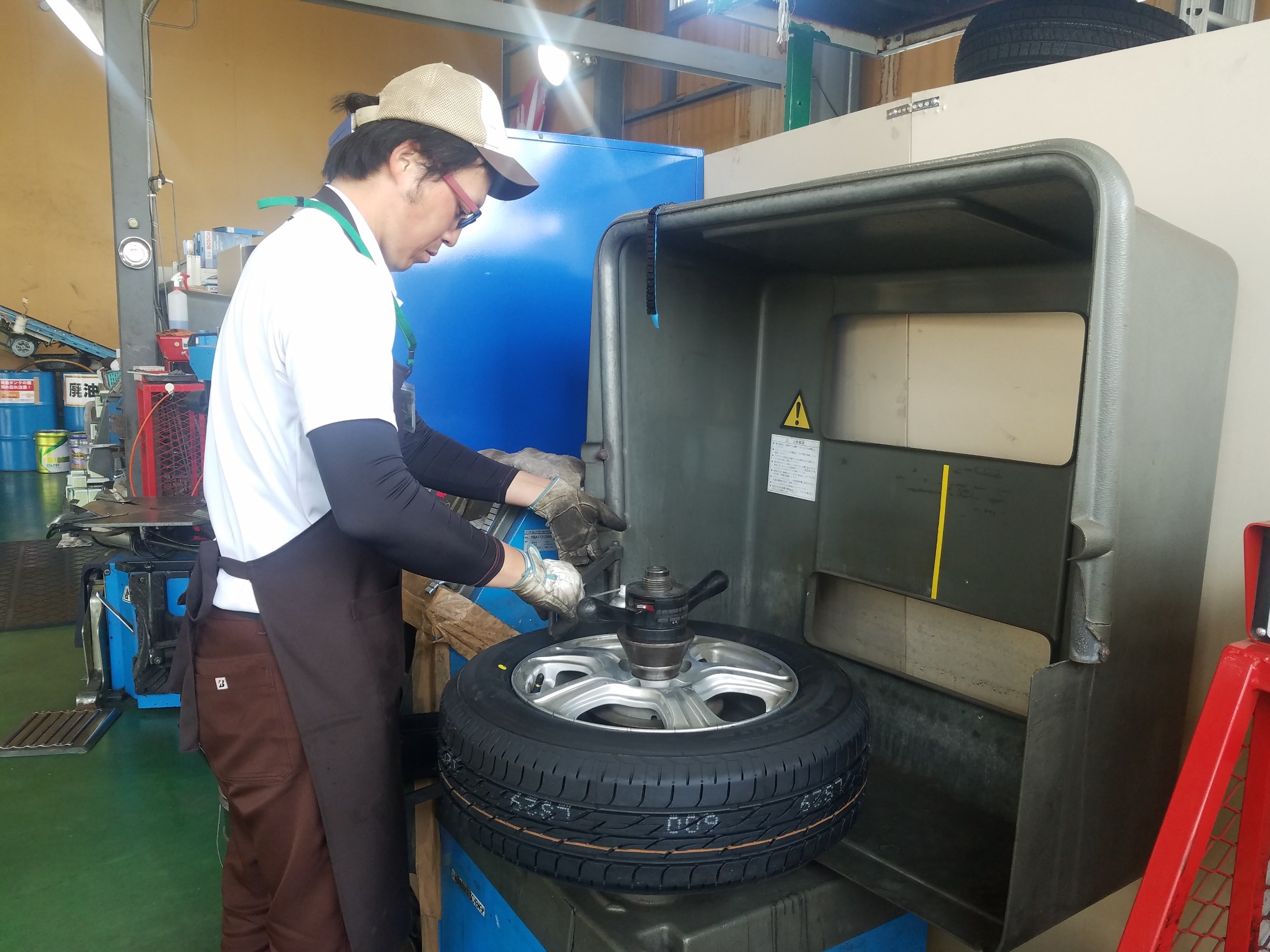 ☆ホイールバランス調整中の佐藤スタッフ☆