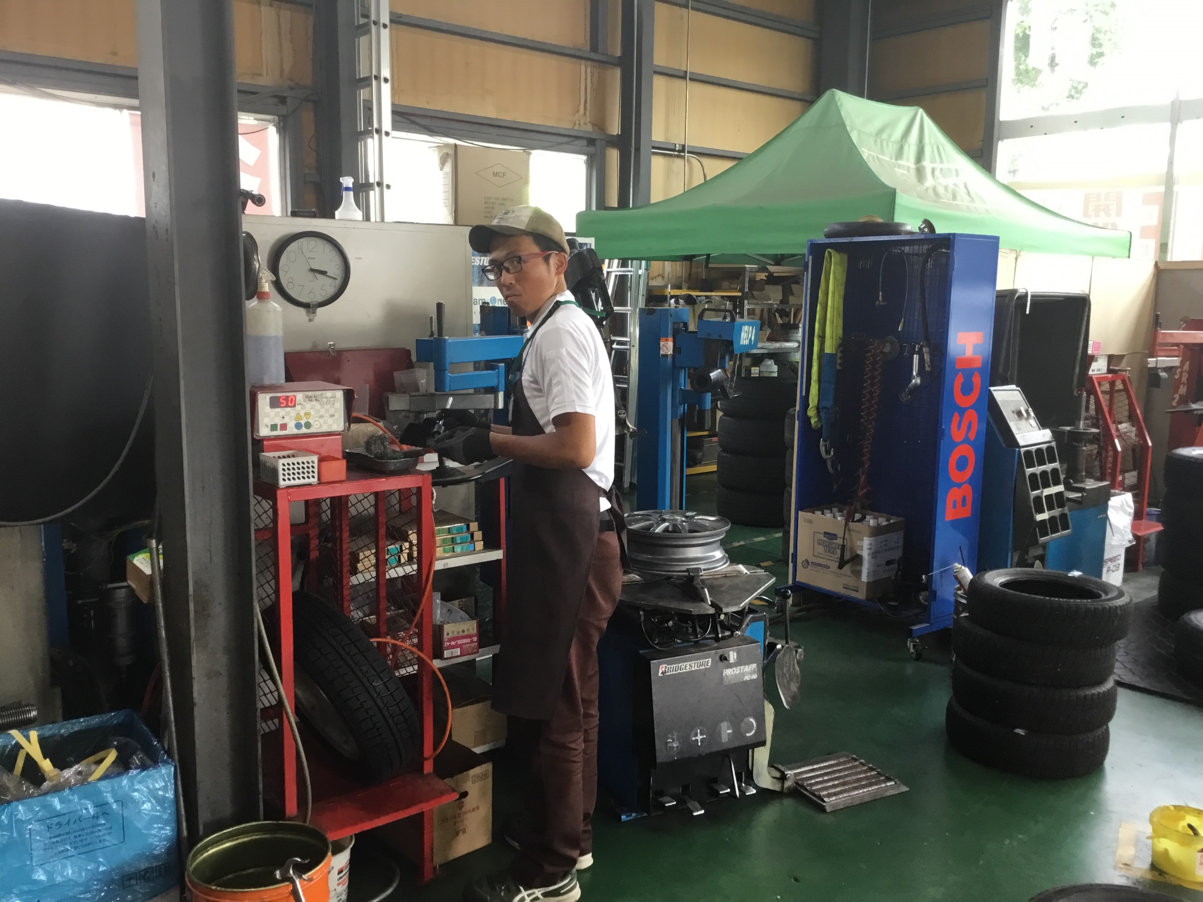 顔が暗く映ってますが丁寧に佐藤スタッフがお客様のタイヤを組込み中!