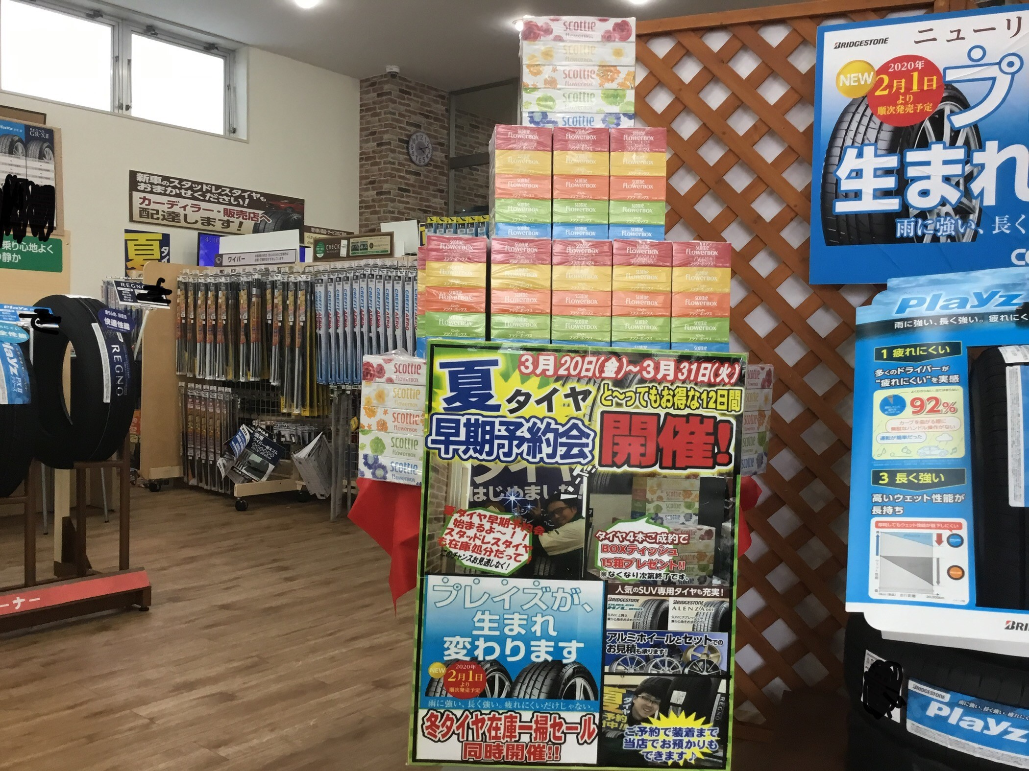 3/20(金)~3/31(火)まで 夏タイヤ早期予約会開催!! ポスト 2020年3月19日 暖かい日が続いています!! もう春ですね!(^^)! そんな中当店では 3/20(金)~3/31(火)まで 夏タイヤ早期予約会開催!! タイヤ4本ご成約でBOXティッシュも15箱プレゼント!! 大変お得な期間になっていますのでご購入を検討されているお客様は是非タイヤ館新川駅前まで!!! 沢山のご来店お待ちしておりまーす!! 担当:佐藤