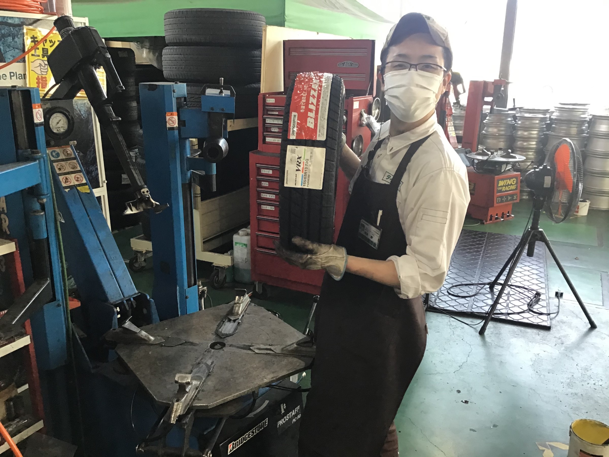 昨日、購入して頂いたお客様のタイヤを組込みしている菊池スタッフです!!