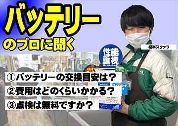 みなさま、こんにちは! まっちゃんこと松本です☆ 本日はバッテリーについて 販売担当の私がお答えしていきます☆ 早速レッツスタート!! ①バッテリーの交換目安は? バッテリーの交換ですが、3年が目安となっています。 アイドリングストップ車であれば約2年となり、 それ以上ご使用になられると...