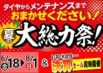 こんにちは!! いつもブログをご覧いただきありがとうございます。 いよいよ7月ですね!! もう夏もすぐそこです(*^^*) タイヤ館では8/1まで大総力祭開催中です!! 夏の旅行前にお車のメンテナンスしませんか?? タイヤはもちろん、エンジンオイルやバッテリーなどの メンテナンス品もお買得に...