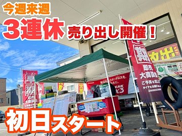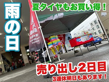 こんにちは!ナミ兵こと浪岡です! 本日は雨模様の3連休中日! 昨日に比べるとお客様のご来店はさすがに少なかったです! 雨という事でテントの位置を昨日は少し変更! 雨風対策しての売り出しとなりました♪ それでもホイールセットや 夏タイヤもご一緒にご検討頂く方など ご来店いただきありがと...