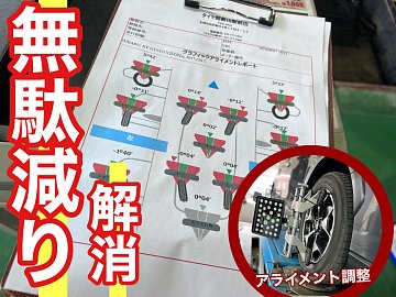 どーもジャイアンです★ タイヤの偏摩耗ってご存じですか? 車の足回りの角度がずれてくると、 タイヤは変な減り方をします!! 実は、どの車でも、ずれるのを想定して作っているので ほとんどの車は調整箇所がついています。 ということは、いずれは調整しなけらばいけないんです!! 「アライメン...