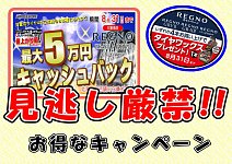 こんにちは(^^)/ 嬉しいお知らせです!! 大人気商品の『REGNO』がお得に購入できるチャンスです!(^^)! 【REGNO キャッシュバックキャンペーン】 期間は7/11(月)~8/31(水)まで!! キャンペーン内容とは… REGNOの商品ご購入で最大5万円キャッシュバック! ※サイズや購入金額で変動します※ タイヤワック...